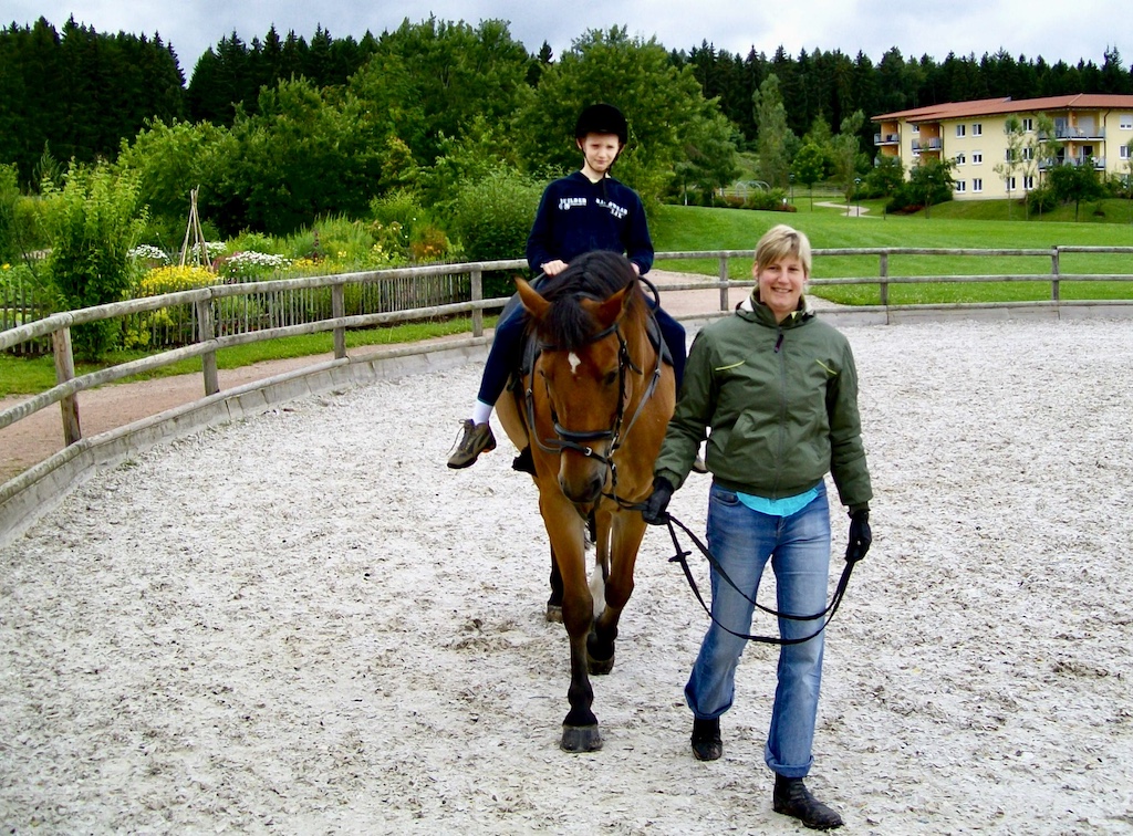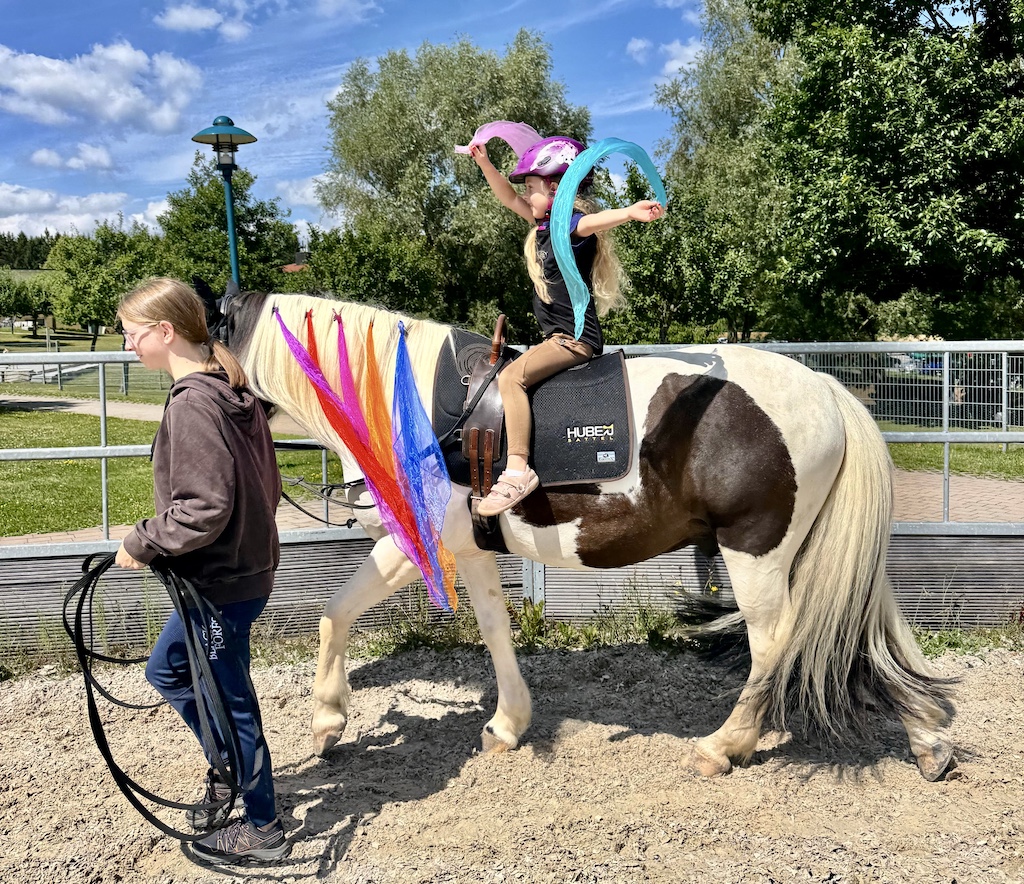 Nach schweren Wochen und Monaten für Ihren 4 jährigen Bruder im Krankenhaus, kam Fine mit Ihren Eltern zur REHA nach Tannheim, um sich als Familie von der Krebs-Erkrankung des Bruders zu erholen. Genau der richtige Ort, um vieles aus den letzten Monaten zu vergessen. Ein Herzklopf-Erlebnis für Marie Theiler und natürlich für unsere Weihnachtsprinzessin Fine. Sie ist ein kleiner und herzlicher Pferdenarr. Lukas, unser Therapiepferd, erwidern sehr gerne Ihre ausgeprägte Freundlichkeit. Neben dem Reiterlebnis standen unbewusst verschiedene Therapieziele auf dem Programm, die Marie Theiler gekonnt in Ihre Therapiestunde einbaute: Neuen Mut fassen, Selbstständigkeit ausprobieren, Gefühle steuern und kontrollieren, aber auch eigene Fähigkeiten zur Geltung kommen zu lassen und Verantwortung für sein Tun zu übernehmen. Die 7 jährige Fine hat ganz viele Therapieziele aufgetankt und nimmt sicher viele Erlebnisse mit nach Hause. Ein Videomitschnitt läßt uns erleben, was eine pferdegestützte Therapieeinheit alles bewirkt.