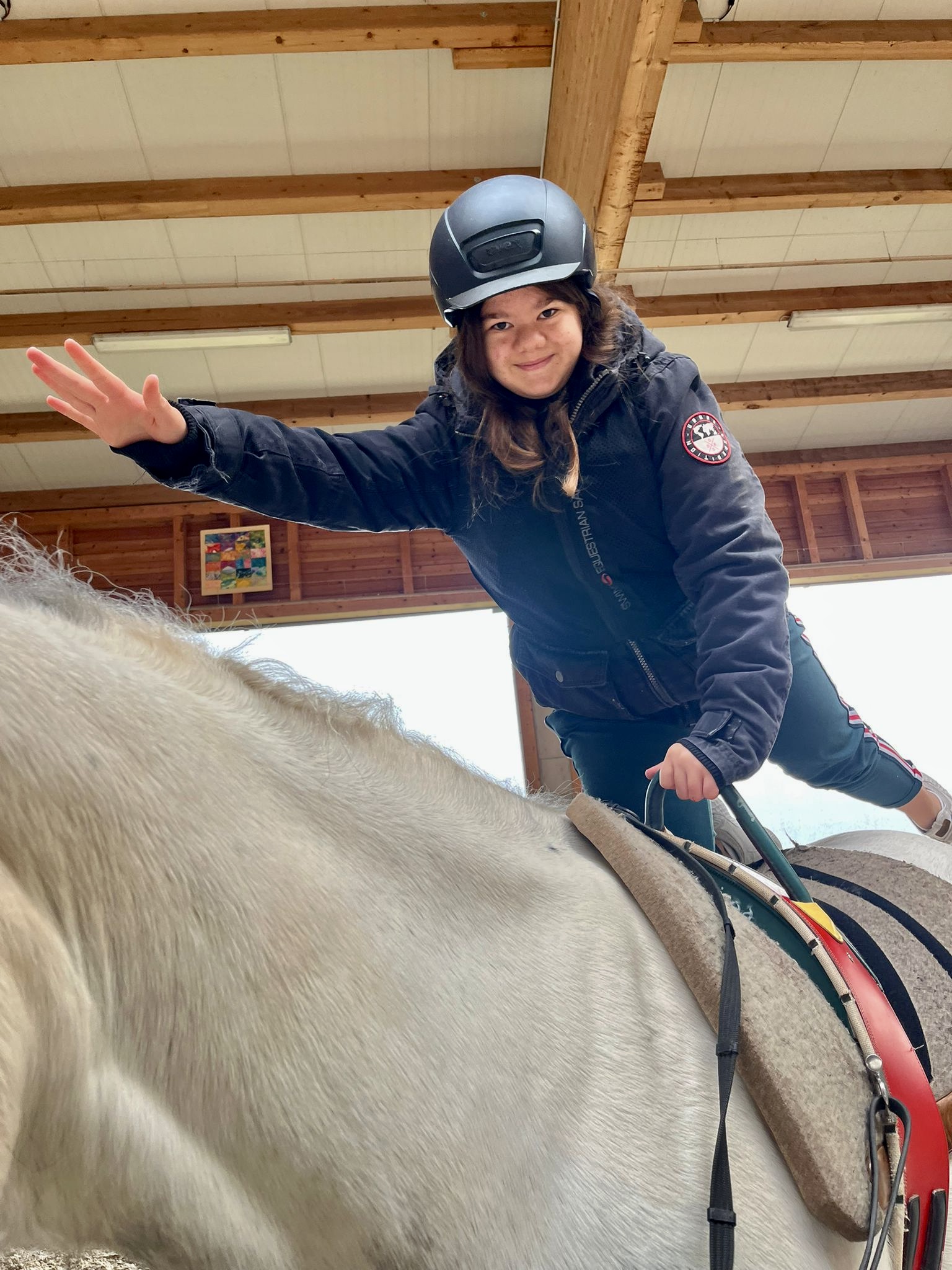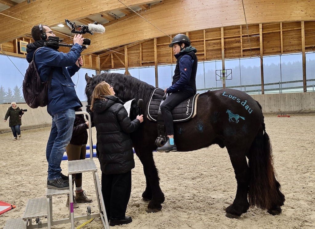 Allerdings war auch in der Reithalle viel Aufregung spürbar. Denn nicht jeden Tag kommt ein Filmteam nach Tannheim und macht über die Arbeit der Reittherapie einen Filmbeitrag. Dieser wird in Kürze bei Fa. Loesdau als Imagefilm zu sehen sein. Wir sind schon sehr gespannt auf das Ergebnis. Natürlich benötigt man für das Kamerabild viele gute Motive mit „Statisten“. Die Kids der Dezember-REHA waren mit Feuereifer dabei und bemalten gerne unser Therapiepferd Leon, um ihn kameratauglich zu machen. Aber auch hoch zu Ross gaben sie eine sehr gute Figur ab und berichteten gerne über Ihre Erlebnisse hier in Tannheim. Selbst der Kameramann benötigte eine Treppe, um Leon, unseren „Riesen“, gut in Szene zu setzen. 🤣🤣🤣