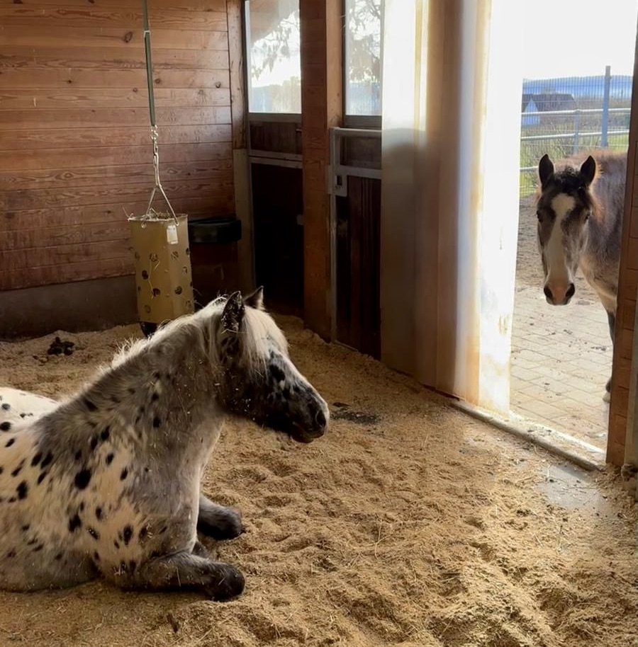 Tagsüber bewegten sie sich im Herdenverband auf unserem großen Allwetterplatz und waren hierdurch gut unterhalten. Gemeinsam bewegen, spielen, ruhen, fressen – genau so, wie es Pferde lieben und dringend benötigen. Diese Zeit in der Gruppe ist ein wichtiger Baustein für ihr körperliches und seelisches Wohlbefinden, das wir bewusst pflegen. Schon während der Reha-Zeiten stehen die Pferde in einem festen Herdenverband draußen, sodass sie sich gut kennen und auch an beschäftigungsfreien Tagen problemlos miteinander auskommen.
