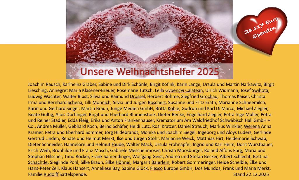 Gleichzeitig sagen wir Danke an 50 Spenderinnen und Spender. Bis zum Nikolaus-Tag sind bereit 12.263 Euro eingegangen. Dass macht uns Mut und unterstützt unser Großprojekt, den Verwaisten-Weg, sehr nachhaltig. Wir hoffen auf weitere Unterstützung bis Weihnachten. Bis dahin ist es noch etwas Zeit.