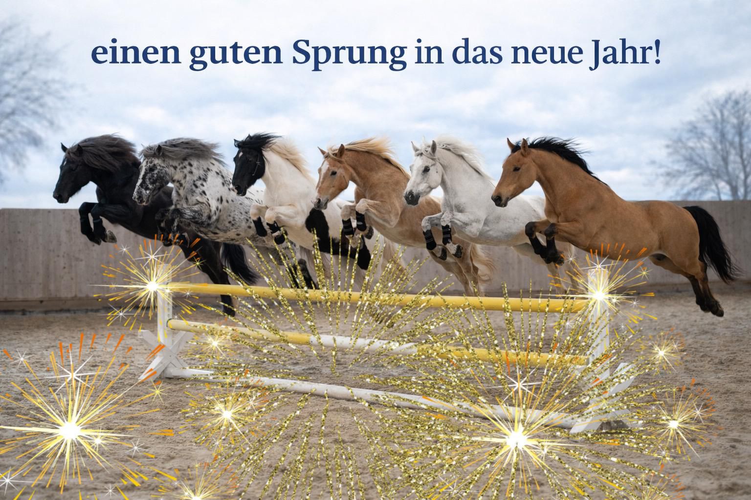 Unsere Therapiepferde schnauften über die Tage zwischen Weihnachten und Neujahr durch. Doch „durchschnaufen“ heißt natürlich nicht Stillstand – denn Pferde benötigen täglich Bewegung, viel Abwechslung und soziale Kontakte untereinander. Sie sind wie kleine Kinder und die Tage ohne Aufgaben sind äußerst unbeliebt. Das nachfolgende Bild ist KI entwickelt. Denn sechs Pferde gleichzeitig ist… dennoch, alle Pferde sind einzeln so gesprungen, und wurden zusammengefügt.