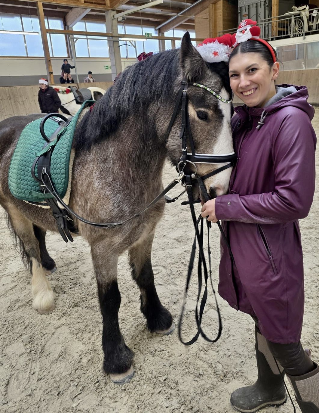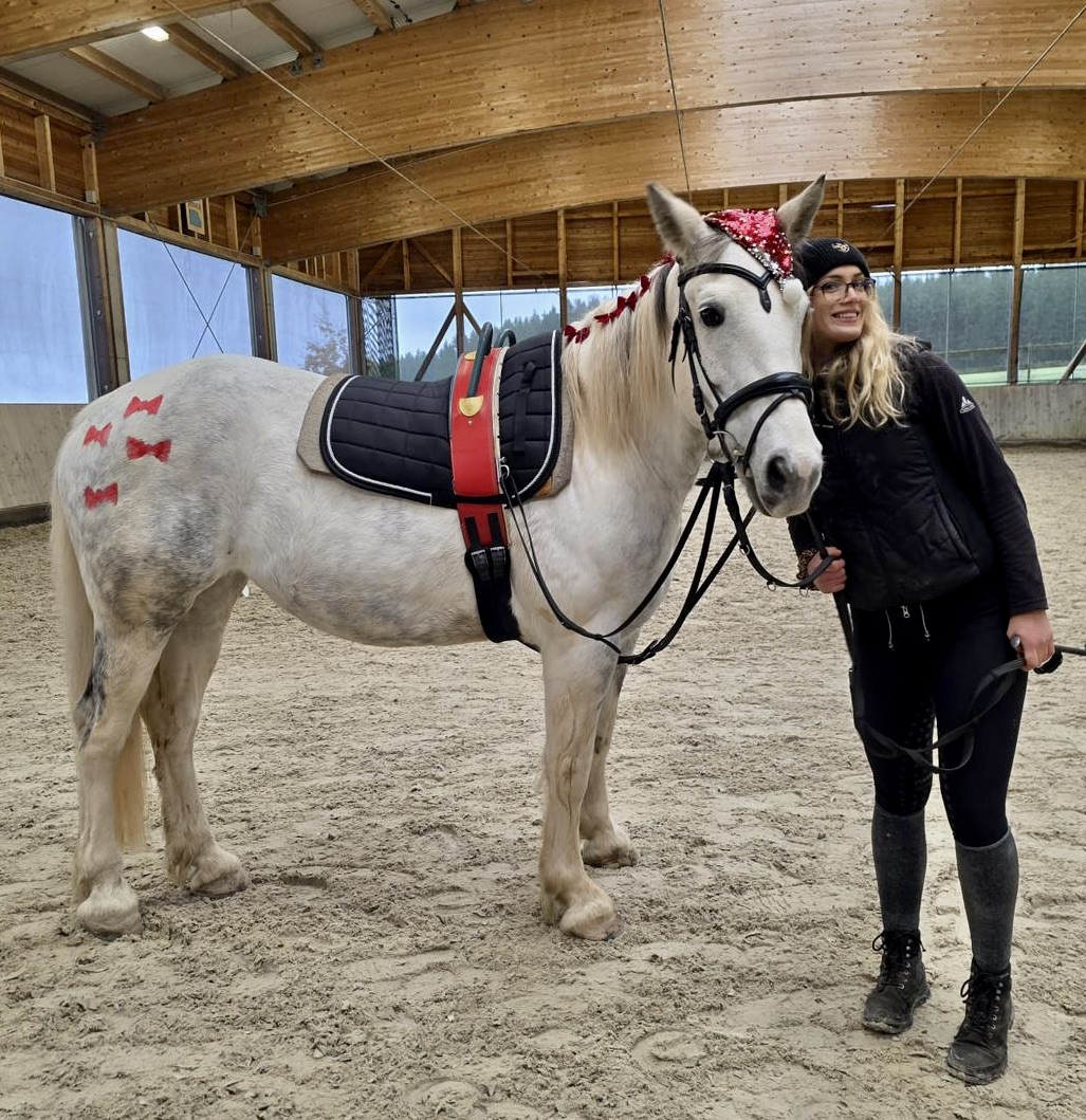 Deshalb nimmt sich unser engagiertes Stallteam ehrenamtlich Zeit für „ihre geliebten Babys“ und sorgt bei entspannten Ausritten für Bewegung und Wohlbefinden. Insider wissen, dass dies von großer Bedeutung für ein ausgeglichenes und zufriedenes Therapiepferd ist. In ruhigem Tempo ins Gelände – eine wertvolle Abwechslung, die für Losgelassenheit sorgt und von unseren Pferden sichtbar genossen wurde. Ein wenig sportlicher sollte es zum Jahreswechsel werden: Gymnastik stand auf dem Programm und ein Sprung ins neue Jahr! Diese Trainingseinheit förderte Beweglichkeit, Koordination und Körpergefühl und machte unseren Pferden richtig Spaß. Mit gut bewegten und zufriedenen Pferden freuen wir uns nun auf die Reha im Januar 2026 und auf viele gemeinsame Momente.