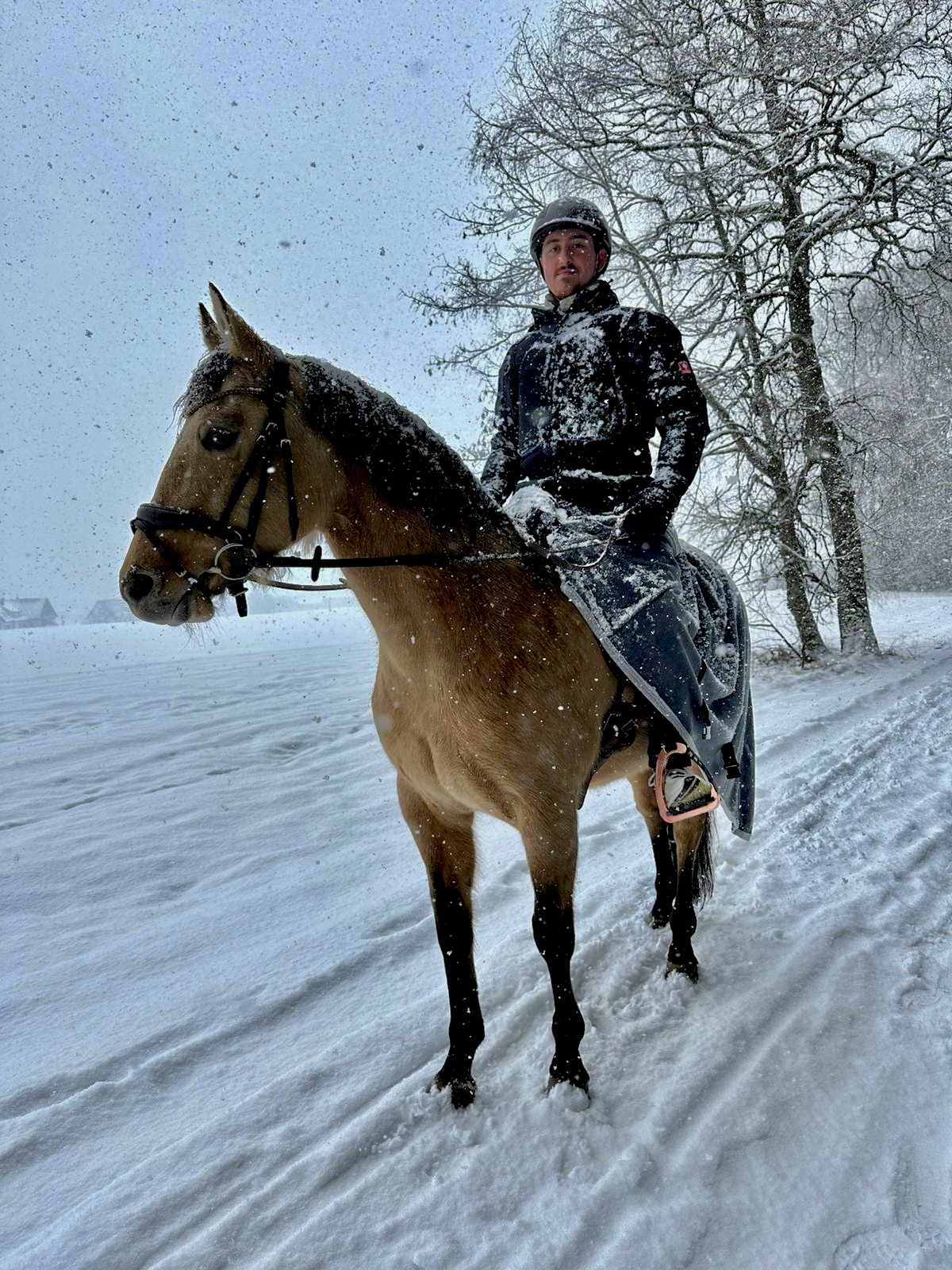 Gemeinsam mit Kristin Betz starteten Sie ins Gelände und genossen die dick verschneite Umgebung. Ein außergewöhnliches Erlebnis, das es nur an wenigen Tagen im Jahr in Tannheim zu erleben gibt. Finn genoss es sichtlich und verdrängte sicher seine Krankheit. Zumindest für die Zeit des Ausrittes. Wir wünschen alles Gute.