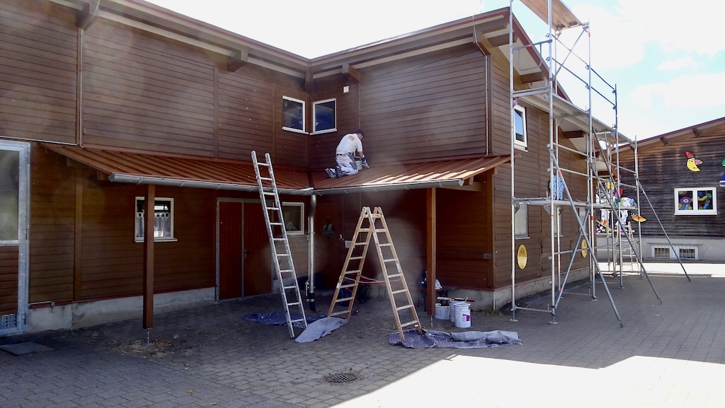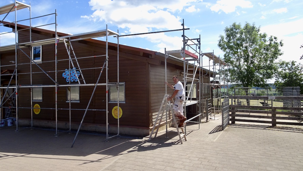 Damit unsere Therapie-Pferde auch in Zukunft nicht im Regen stehen, musste ein neuer Anstrich unseres Stalldaches her. Nun sind die Arbeiten dazu abgeschlossen und unser Dach erstrahlt in neuem Glanze. Vielen Dank an die Mitglieder des Fördervereins im Namen unserer Vierbeiner, die hier so treu ihren Dienst absolvieren.