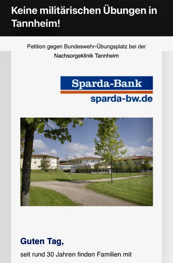 Inzwischen unterstützen uns mehr als 21.000 Menschen. Wir hoffen sehr, dass mit dieser großen Anzahl an Unterstützern das Verteidigungsministerium und damit die Bundeswehr in der Auseinandersetzung um den Standortübungsplatz einlenken wird. Doch der Aufruf der Sparda-Bank BW wird das Bild in den nächsten Tagen deutlich verändern. Wir freuen uns sehr, dass unsere Petition starken Rückenwind erhalten hat.
