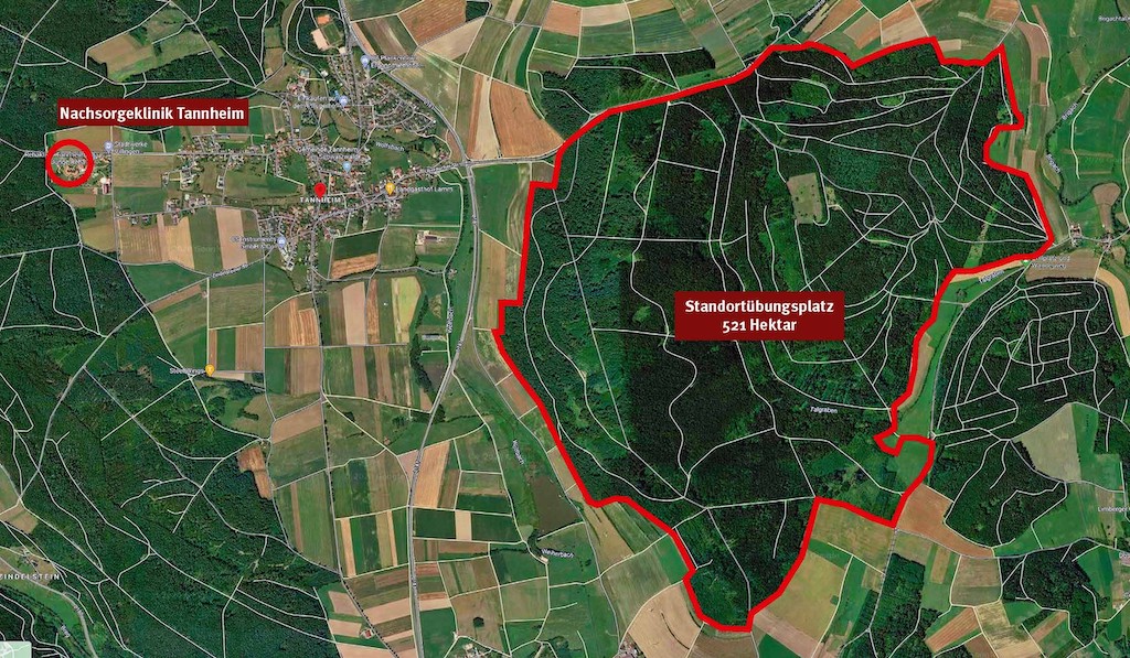 Um einmal die Dimension des neues Standortübungsplatz und vor allem der viel zu geringe Abstand zur Nachsorgeklinik Tannheim zu verdeutlichen, haben die Verantwortlichen eine eindrucksvolle Grafik angefertigt. Sie macht mehr als deutlich, dass so ein massiver Eingriff in das Erholungskonzept der Klinik nicht hinzunehmen ist.