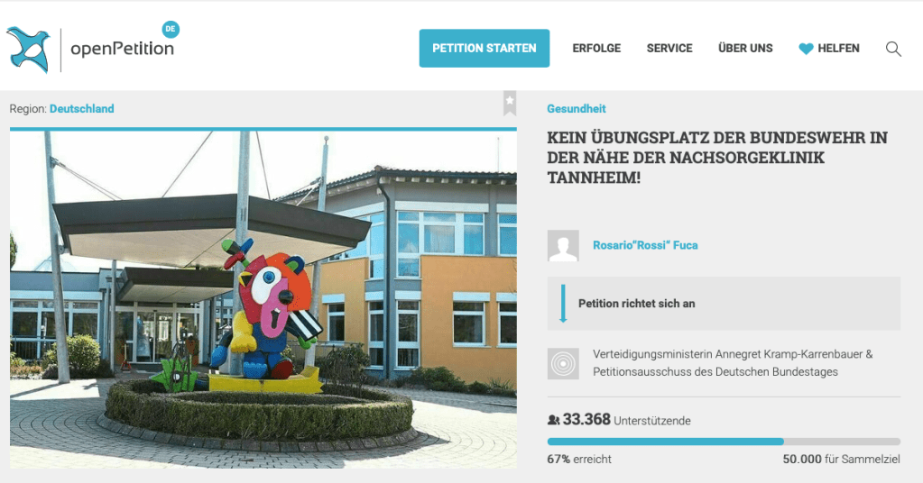 Die Petition gegen den Standortübungsplatz der Bundeswehr ist ein großer Erfolg. Alle deutschen Bundesländer unterstützen uns hierbei! Hierauf sind wir mächtig stolz, macht aber auch deutlich, dass wir als baden-württembergische Klinik allen betroffenen Familien aus jeder Region Deutschlands helfen!