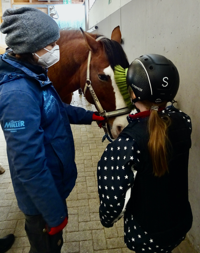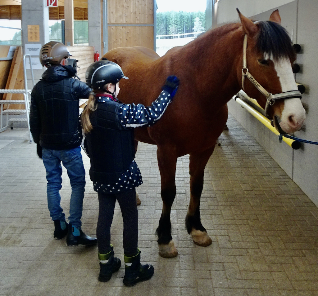 Pferdepflege, ein wichtiger Aspekt in der Reittherapie. Hierbei geht es nicht nur darum, ein Pferd sauber zu halten. Es geht vielmehr um Dinge wie: Kontaktaufnahme, Abbau von Berührungsängsten, Erleben von Körpernähe oder das Erlernen von Handlungskompetenzen. Pferde sind sehr soziale Wesen. Sie haben sich als Fluchttier hoch spezialisierte Wahrnehmungs-und Verhaltensweisen angelernt. Deshalb können sie bei ihrem Gegenüber sofort emotionale Spannungsfelder wahrnehmen und sich entsprechend darauf einstellen.