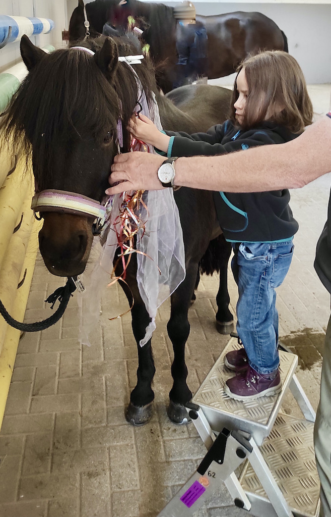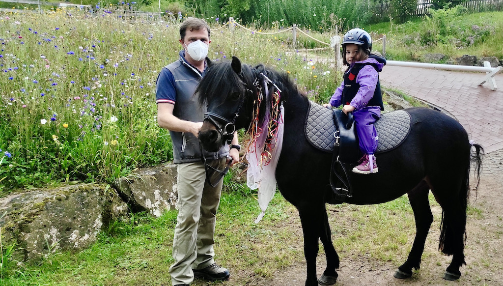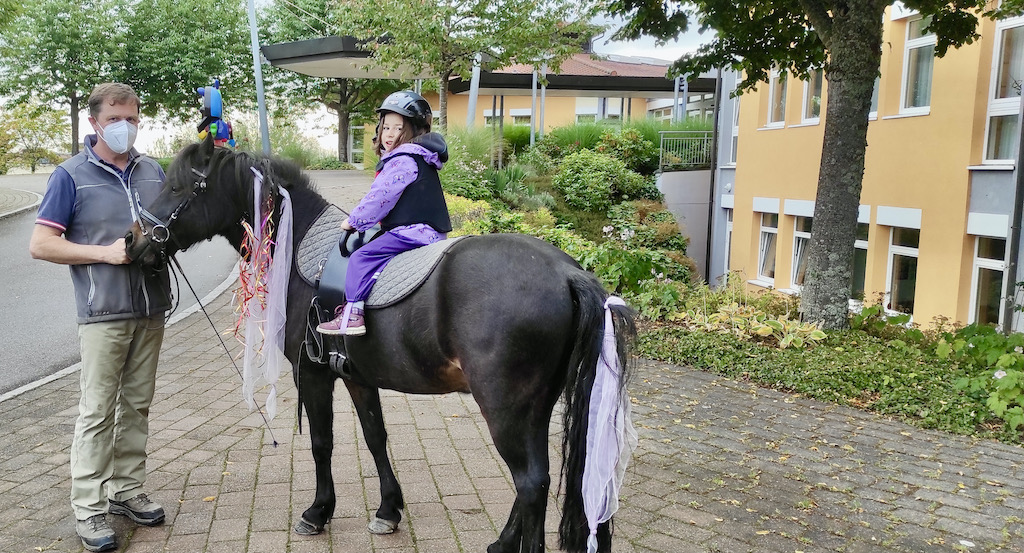 Was der Größe wegen nicht gelingt, wird umgehend mit einer Leiter gelöst. Auge in Auge mit einem Pferd zu stehen, ist schon ein besonderes Erlebnis. Der anschließende Ausritt darf natürlich nicht fehlen. Einmal über das gesamte Gelände der Nachsorgeklinik in dieser Höhe geführt zu werden, wird Ihr immer im Gedächtnis bleiben.