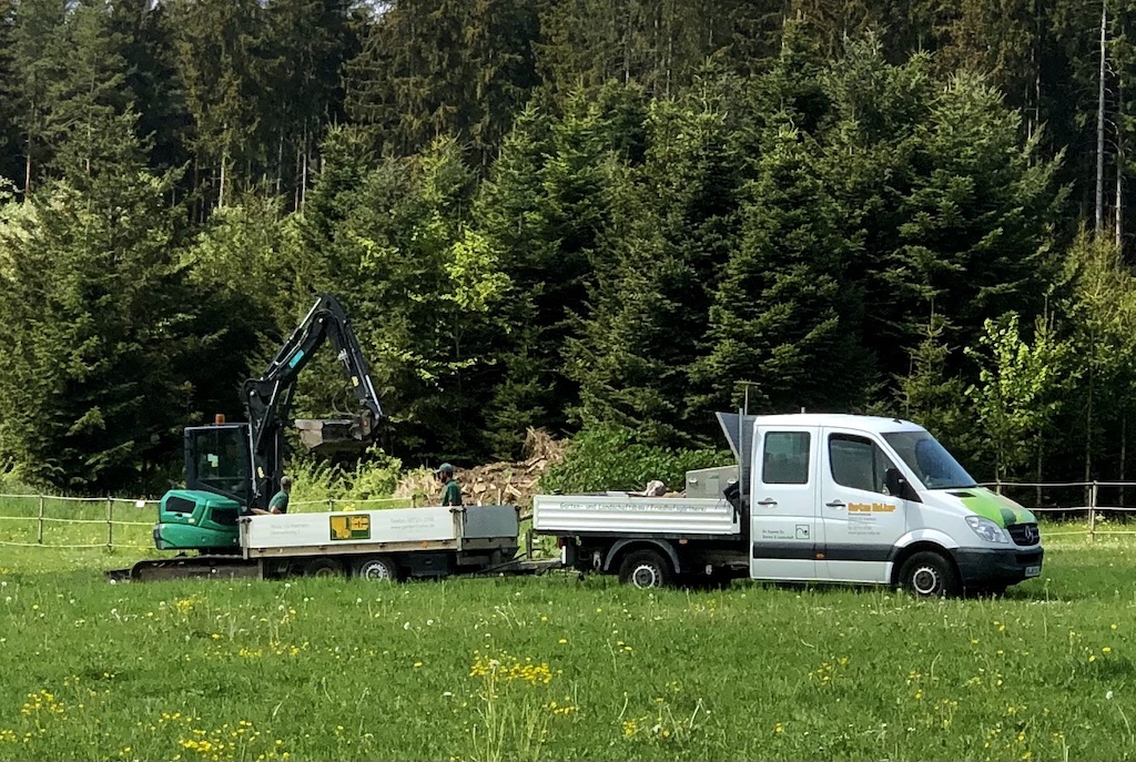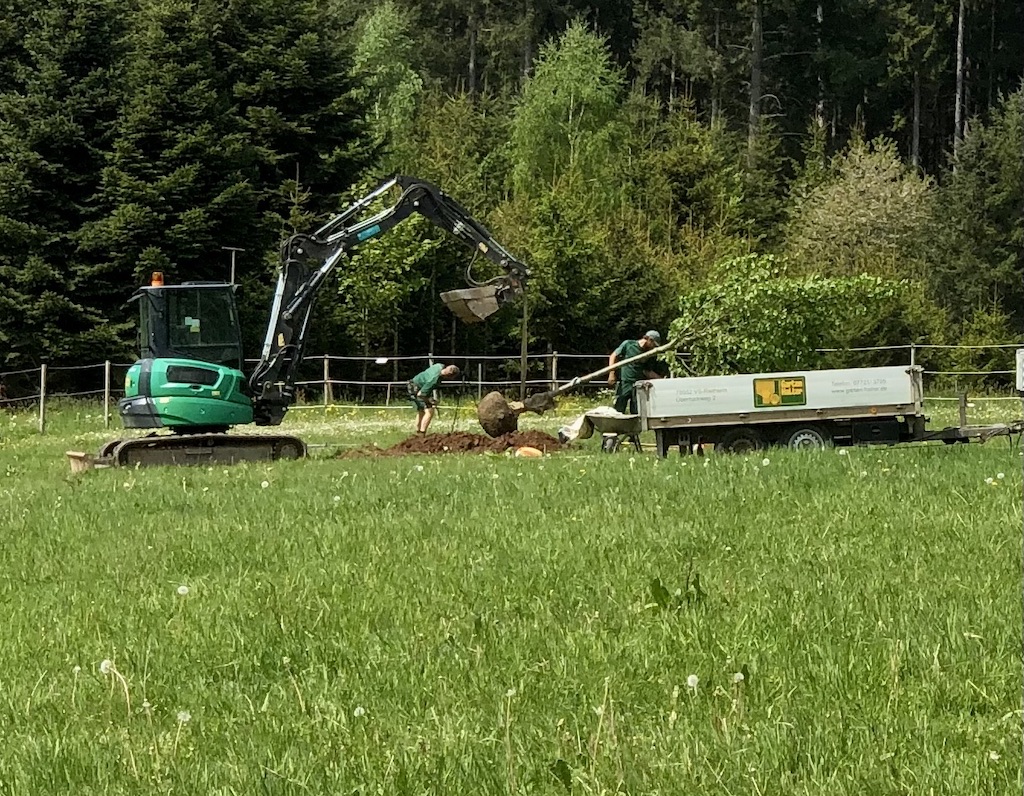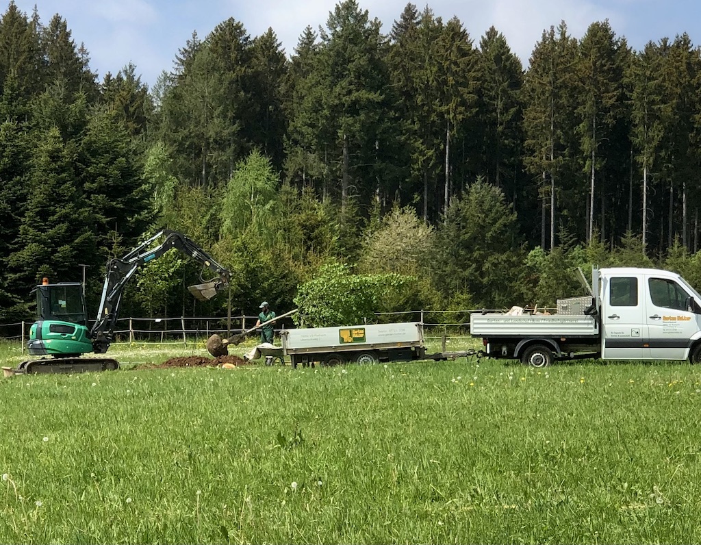Schweres Gerät ist notwendig, um die Pflanzlöcher in den felsigen Boden des Geländes der Nachsorgeklinik zu treiben. Aber wer unseren Gartenbau-Spezialist Erwin Halter kennt weiß, dass er an alles gedacht hat und es äußerst genau nimmt. Das Gelände ist an jeder Pflanzstelle unterschiedlich geneigt, weshalb eine elektronische Wasserwaage unverzichtbar ist. Und wer kontrolliert das? Natürlich der Chef höchstpersönlich! 👍👍👍
