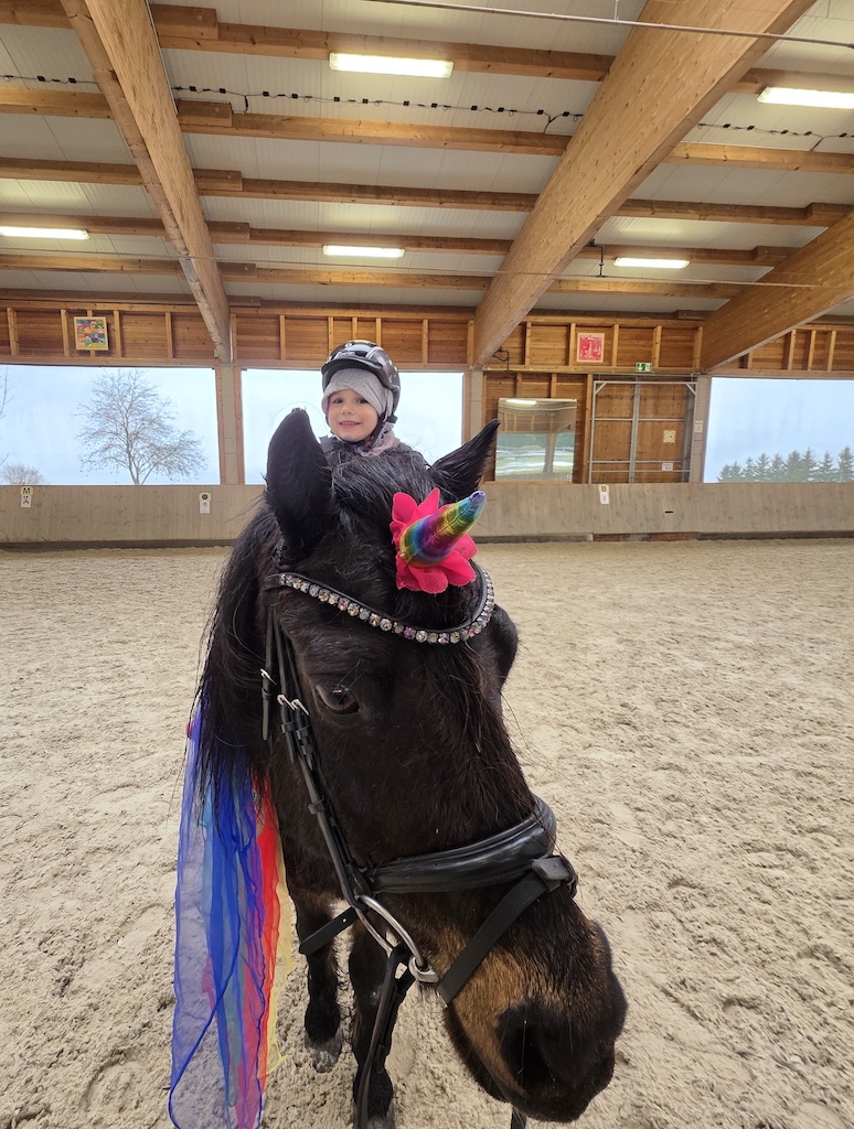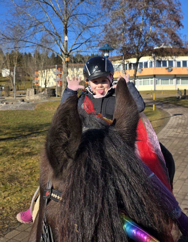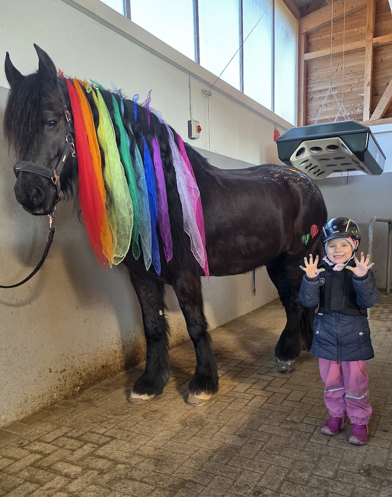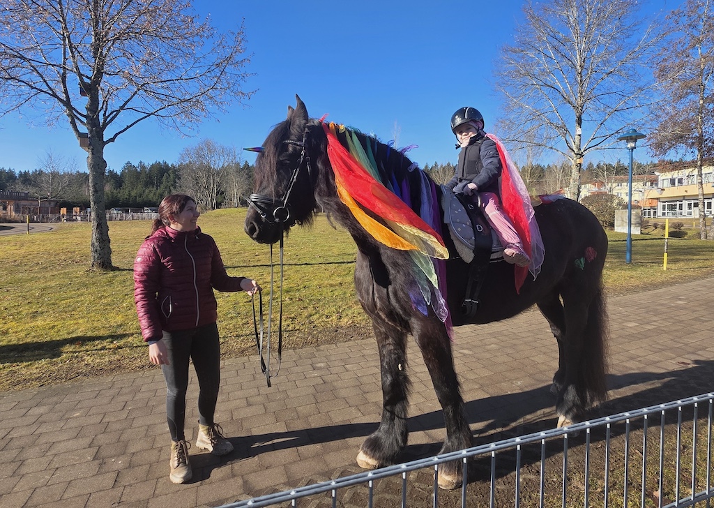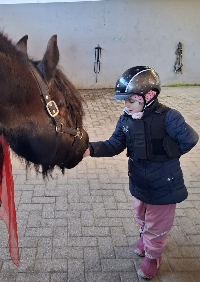 Karlines Bericht (6 Jahre, jüngste Schwester, „Survivor“) „Als ich erfuhr, dass auch ich therapeutisches Reiten bei Marie bekomme, hatte ich ganz viel Vorfreude. Ich konnte es kaum erwarten, wieder zu den Pferden zu gehen. Wir haben so viele schöne Sachen gemacht. Ich durfte Pferde bemalen, und ich habe es geliebt, Parcours zu bauen. Der kleine Flipp ist mir besonders ans Herz gewachsen. Er ist am gleichen Tag im gleichen Jahr geboren wie meine große Schwester Charlotte, und er kann sogar Zirkustricks. Ich hatte überhaupt keine Angst, alleine in den Stall zu gehen, ohne Mama oder Papa. Es hat sich für mich einfach richtig angefühlt. Mit Marie konnte ich von Anfang an gut quatschen und auch Quatsch machen. Sie war immer lieb und hat mir zugehört. Besonders stolz bin ich darauf, dass ich in meiner letzten Therapiestunde den großen Friesen Leon bemalen durfte und seine Mähne mit bunten Tüchern dekorieren konnte. Dafür brauchte ich sogar eine Leiter, weil er so riesig ist. Danach bin ich wie eine Prinzessin geschwebt – sogar im Trab. Ganz toll fand ich es immer, wenn wir an der Schildigruppe vorbeigeritten sind und ich meinen Freunden und den lieben Erziehern winken konnte. Das hat mich jedes Mal glücklich gemacht. Jetzt vermisse ich alle sehr – die Pferde, Marie, Flipp, Pünktchen, Leon und den ganzen Stall.“
