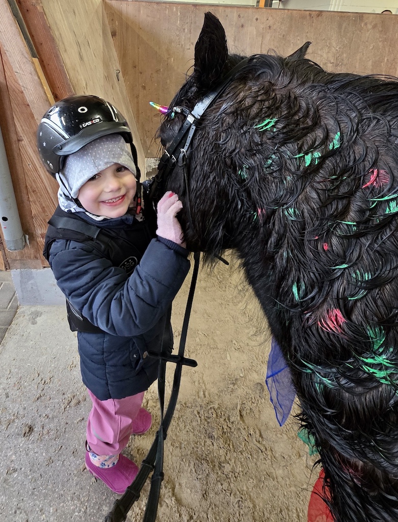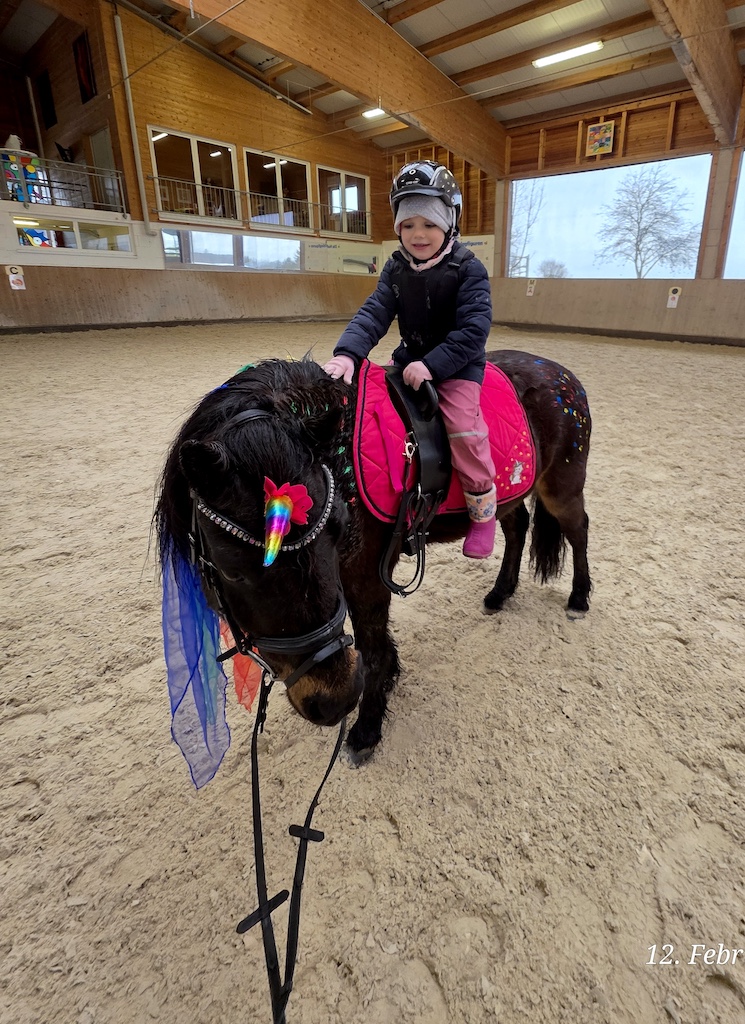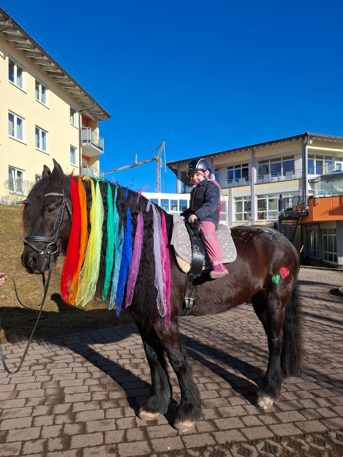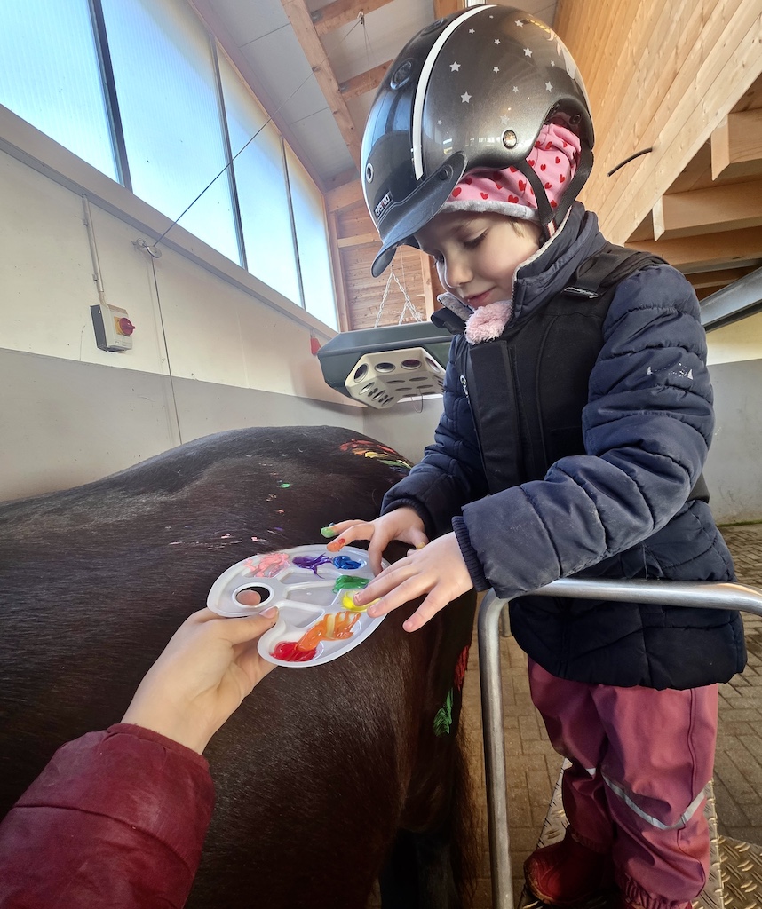 Karlines Bericht (6 Jahre, jüngste Schwester, „Survivor“) „Als ich erfuhr, dass auch ich therapeutisches Reiten bei Marie bekomme, hatte ich ganz viel Vorfreude. Ich konnte es kaum erwarten, wieder zu den Pferden zu gehen. Wir haben so viele schöne Sachen gemacht. Ich durfte Pferde bemalen, und ich habe es geliebt, Parcours zu bauen. Der kleine Flipp ist mir besonders ans Herz gewachsen. Er ist am gleichen Tag im gleichen Jahr geboren wie meine große Schwester Charlotte, und er kann sogar Zirkustricks. Ich hatte überhaupt keine Angst, alleine in den Stall zu gehen, ohne Mama oder Papa. Es hat sich für mich einfach richtig angefühlt. Mit Marie konnte ich von Anfang an gut quatschen und auch Quatsch machen. Sie war immer lieb und hat mir zugehört. Besonders stolz bin ich darauf, dass ich in meiner letzten Therapiestunde den großen Friesen Leon bemalen durfte und seine Mähne mit bunten Tüchern dekorieren konnte. Dafür brauchte ich sogar eine Leiter, weil er so riesig ist. Danach bin ich wie eine Prinzessin geschwebt – sogar im Trab. Ganz toll fand ich es immer, wenn wir an der Schildigruppe vorbeigeritten sind und ich meinen Freunden und den lieben Erziehern winken konnte. Das hat mich jedes Mal glücklich gemacht. Jetzt vermisse ich alle sehr – die Pferde, Marie, Flipp, Pünktchen, Leon und den ganzen Stall.“