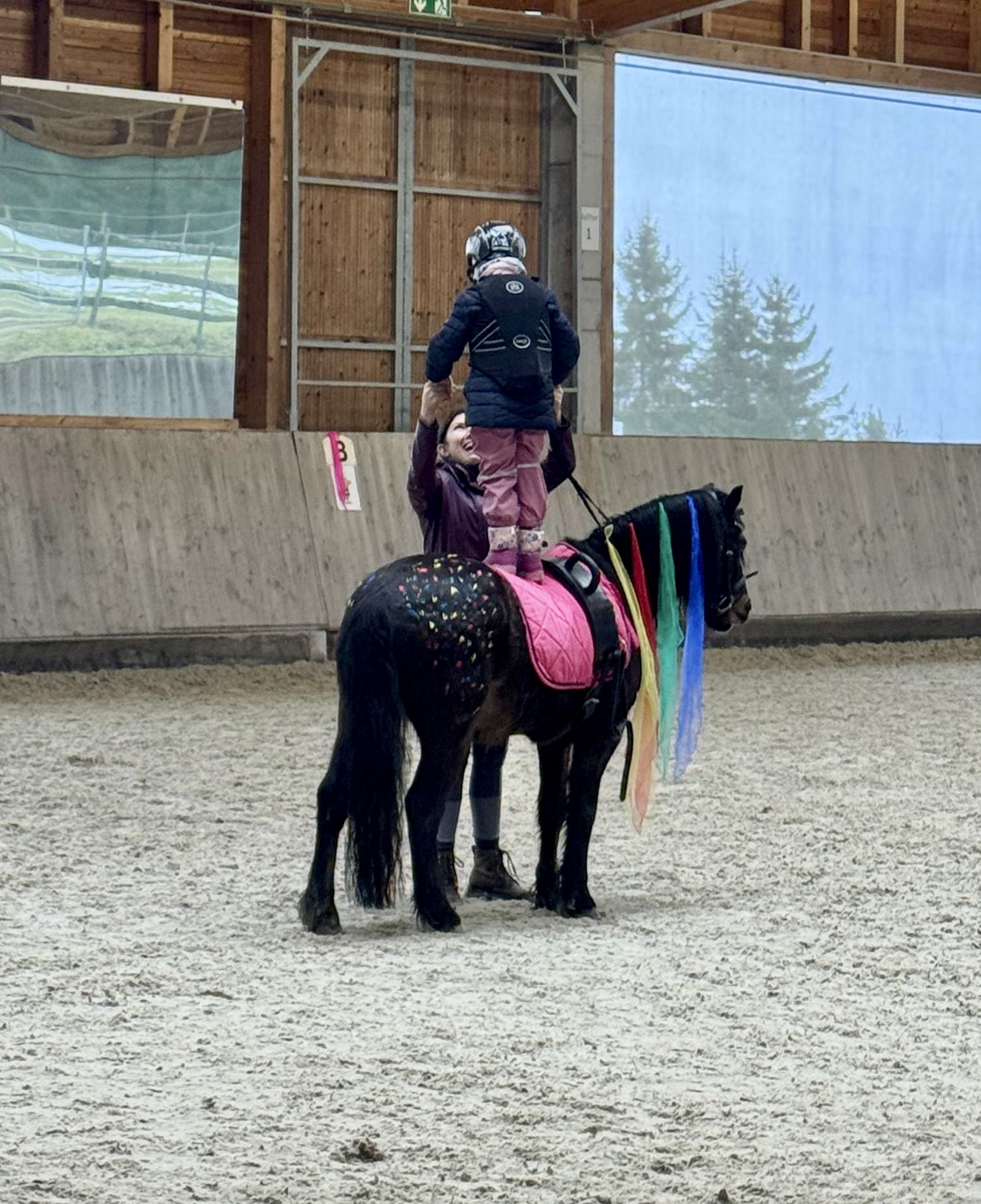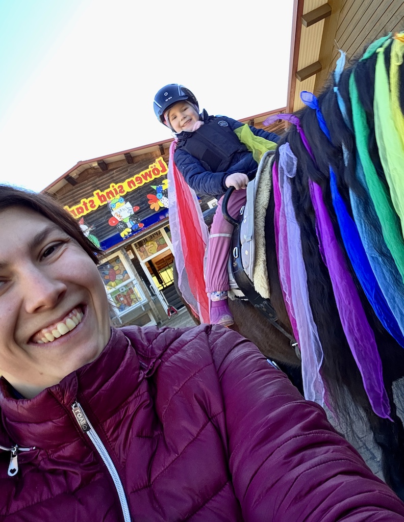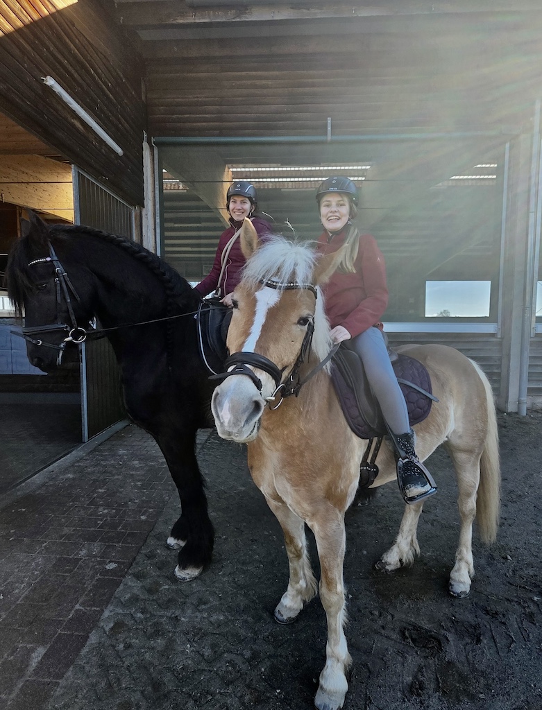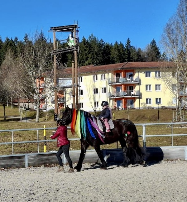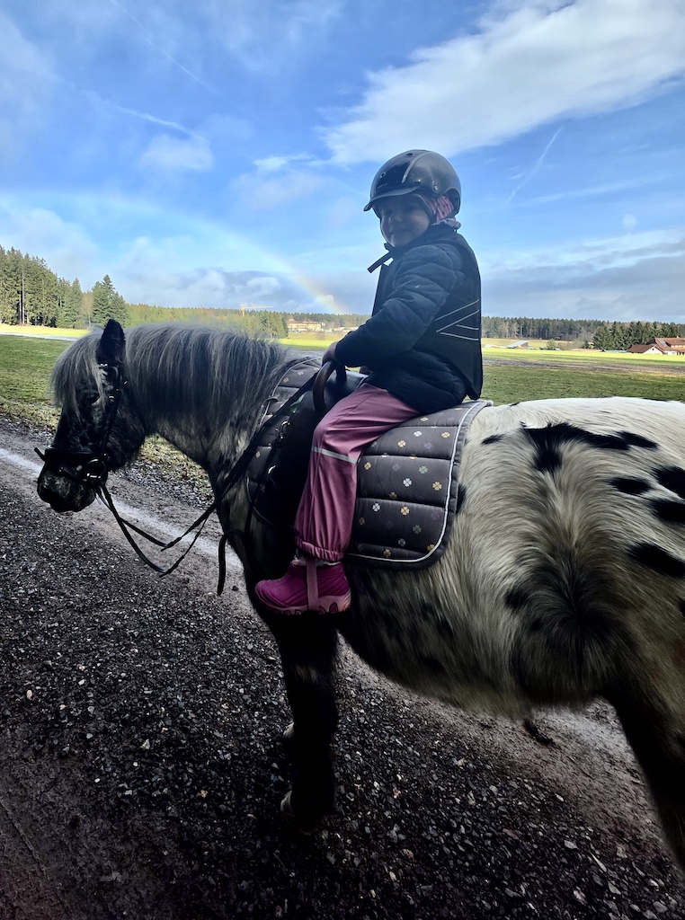 Sandras Bericht (40 Jahre, Mutter von 3 Töchtern): „Als Therapeutin Frau Wolf erfuhr, dass wir alle das Pferd.Gen in uns tragen, griff sie sofort zum Telefon. Sie rief Arnold an, um zu fragen, ob auch ich reiten dürfe. In diesem Moment hat sich die REHA, die sich ohnehin schon unwirklich angefühlt hatte, noch mehr wie ein Traum angefühlt. Die Vorstellung, wieder auf einem Pferd sitzen zu dürfen, hat in mir eine Aufregung ausgelöst, die ich kaum beschreiben kann. Ein lang ersehnter Mädchentraum ging für mich in Erfüllung. Ich durfte den wunderschönen, sanftmütigen Friesenwallach Leon reiten. Der Kontakt zu Marie und Kristin war von Anfang an so herzlich, dass man die beiden sofort ins Herz schließen musste. Sie haben mir meine Zweifel genommen und mir eine Zuversicht geschenkt, die ich lange nicht mehr gespürt hatte. Die Konzentration beim Reiten, dieses Einswerden mit dem Pferd, hat keinen Raum gelassen für Ängste oder Sorgen. Die Zeit im Stall hat mein Grübeln nicht nur pausiert – sie hat es sanft zur Seite geschoben. Ich bin jedes Mal mit einem tiefen, klaren Seelenfrieden aus dem Stall gegangen, als hätte ich für einen Moment wieder zu mir selbst gefunden. Mein Highlight kam am letzten REHA-Tag: ein Ausritt auf Riba durch den wunderschönen Schwarzwald, eingehüllt in warmes Frühlingslicht. Kristin ritt auf Leon, eine befreundete Mama auf Nico. Dieser Ausritt fühlte sich an wie ein Geschenk – ein Moment, der alles zusammenfasste: Heilung, Vertrauen, Loslassen, Dankbarkeit. Ein Abschied, der gleichzeitig schmerzte und erfüllte. Unglaublich, unfassbar schön und getragen von dem Gefühl, dass wir etwas Kostbares mitnehmen, das bleibt, auch wenn der Abschied unwahrscheinlich schwer fiel.