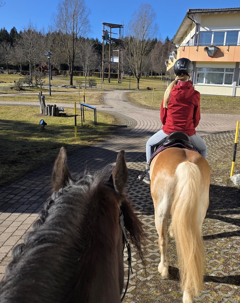 Marie hat mit ihrer besonderen Art ein großes Vertrauensverhältnis zu mir aufgebaut. So groß, dass ich ihr alles erzählen konnte, was mich bedrückt. Es war eine Begegnung auf Augenhöhe – freundschaftlich, ganz nah und ehrlich. Dann kam eine ganz besondere Therapiestunde. Auf Riba durfte ich an Maries Seite durch den frisch verschneiten Schwarzwald reiten. Es war nicht nur mein erstes Mal im Schnee zu reiten, sondern auch seit einer Ewigkeit wieder ein richtiger Ausritt. Hierbei konnte ich Dinge aussprechen, die ich vorher nicht sprechen konnte. Dinge, die ich tief in mir verschlossen hatte. Am Ende unseres Aufenthalts habe ich gemerkt, wie viel sich in mir verändert hat. Wie viel stärker, klarer und freier ich geworden bin. Marie ist eine wunderbare Lehrerin – nicht nur im Reiten, sondern im Leben. Der Abschied von den Tieren, den Menschen im Stall und dieser morgendlichen Routine fällt mir unglaublich schwer. Aber ich glaube fest daran, dass ich zurückkommen werde. Und allein dieser Gedanke trägt mich weiter.“