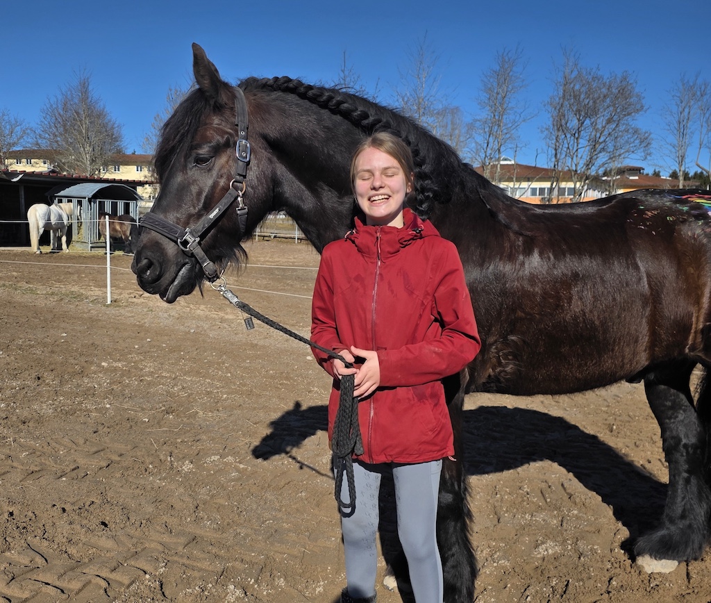 Charlottes Bericht (13 Jahre, älteste Schwester): „Als ich erfahren habe, dass ich therapeutische Reittherapie bekommen werde und zweimal in der Woche zu den Pferden kann, war meine Freude riesengroß. Vielleicht war ich deshalb so unglaublich aufgeregt – so richtig kribbelig vor Vorfreude. Und dann begann alles mit einem Auftakt, der sich wie ein Mädchentraum angefühlt hat: Ich durfte Leon, den Friesenwallach reiten, diesen großen, sanftmütigen Riesen. Gleichzeitig habe ich meine Reittherapeutin Marie kennengelernt, die mir von Anfang an GROßES zugetraut hat – im wahrsten Sinne. Sie hat mich frei reiten lassen. So glücklich war ich lange nicht mehr, und die Vorfreude auf die nächste Stunde wurde nur noch größer. Als ich gehört habe, dass man morgens beim Misten und beim Pferde-auf-die-Koppel-führen helfen kann, ist mein Herz noch höher gesprungen. Ab da war ich jeden Wochentag von sieben bis acht Uhr im Stall. Ich habe mit Arnold tolle Gespräche geführt, die ich sehr genossen habe, und ich habe jeden Tag mit dem besten Geruch der Erde begonnen. Ja, ich war oft müde, aber die Motivation, täglich bei den Pferden zu sein, war größer als alles andere.