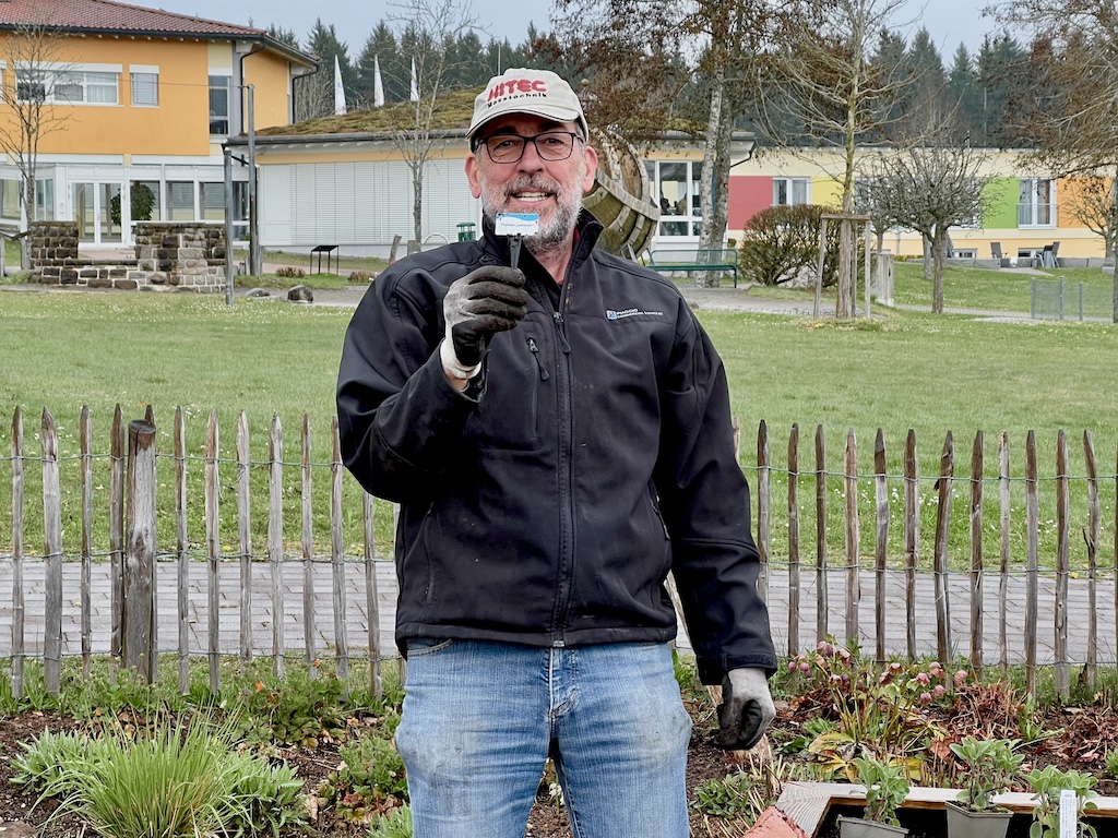 Auch im letzten Jahr legten wir eine Kaffeepause ein, weil es zu massiv regnete. Kein Beinbruch, denn unser Stiftungsteam um Steffi Rothmund hat uns noch immer bestens versorgt, dass eine Regenpause in der Gartenhütte zu den angenehmen Seiten eines Pflanztages zählt. Wir nehmen es so, wie es kommt. Der 20. April steht und hier tritt Volker Kugel im Bauerngarten an – komme was wolle. Wie in den letzten Jahren werden Gemüsesorten noch nicht eingesetzt. Sie können witterungsbedingt in Tannheim erst im Mai gepflanzt werden. Katharina Biedermann wird das mit Ihrem Mann Alex bei passender Gelegenheit im Mai nachholen.