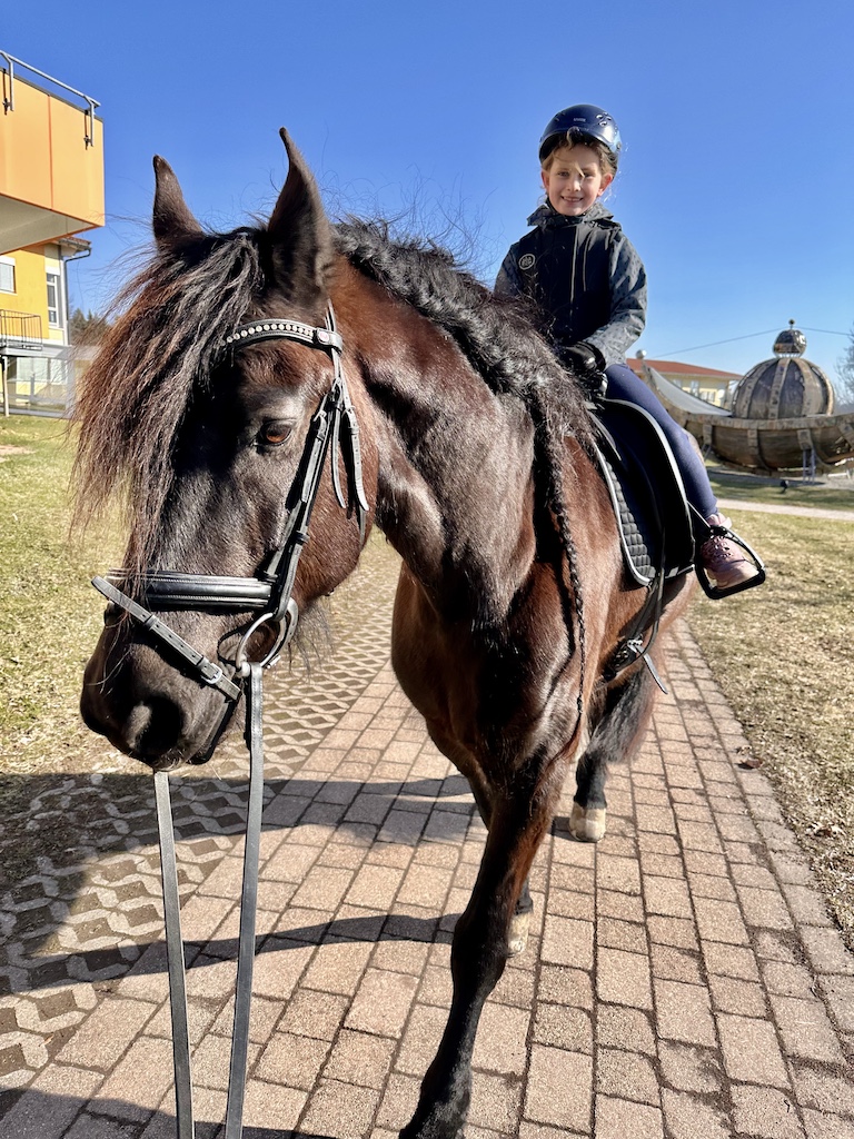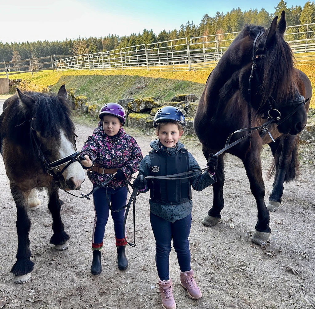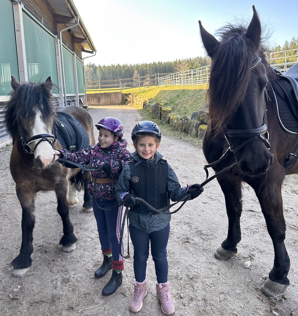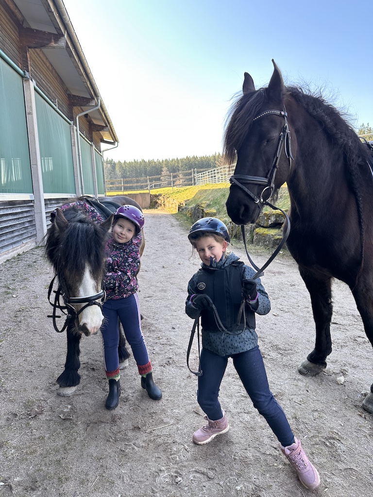 Für die Beiden ging ein riesiger Wunsch in erfüllen, gemeinsam auszureiten. Cecile saß zum ersten Mal auf dem großen Leon und fühlte sich sofort sicher und geborgen. Leon ist nicht nur besonders schön anzusehen, er lieb Kinder über alles. Katharina bevorzugt unsere kleine und lustige Cookie. Cookie ist seit Herbst 2025 bei uns. Sie tritt fleißig in die Fußstapfen von Chek und ist trotz ihres jungen Alters bereits ein total zuverlässiger Ko-Therapeut ☺️👍🏼. Unser Trainerteam ist total happy mit unserer bunten Mischung an Pferden. Von groß bis klein, von ruhig bis aufgeweckt, ist alles dabei. Hierdurch finden wir immer ein passendes Therapiepferd für unsere REHA-Kids. Nun stand dem Ausritt nichts mehr im Wege und die Freude war Katharina und Cecile ins Gesicht geschrieben.