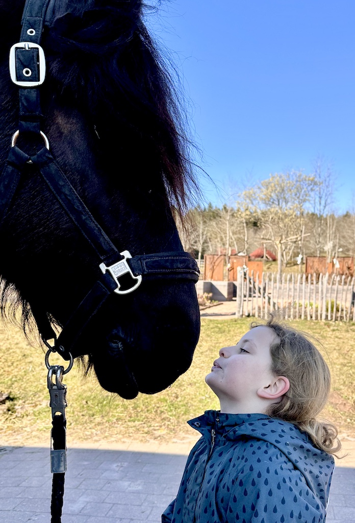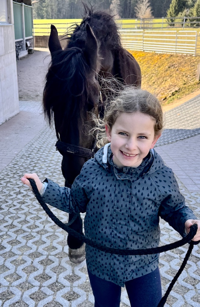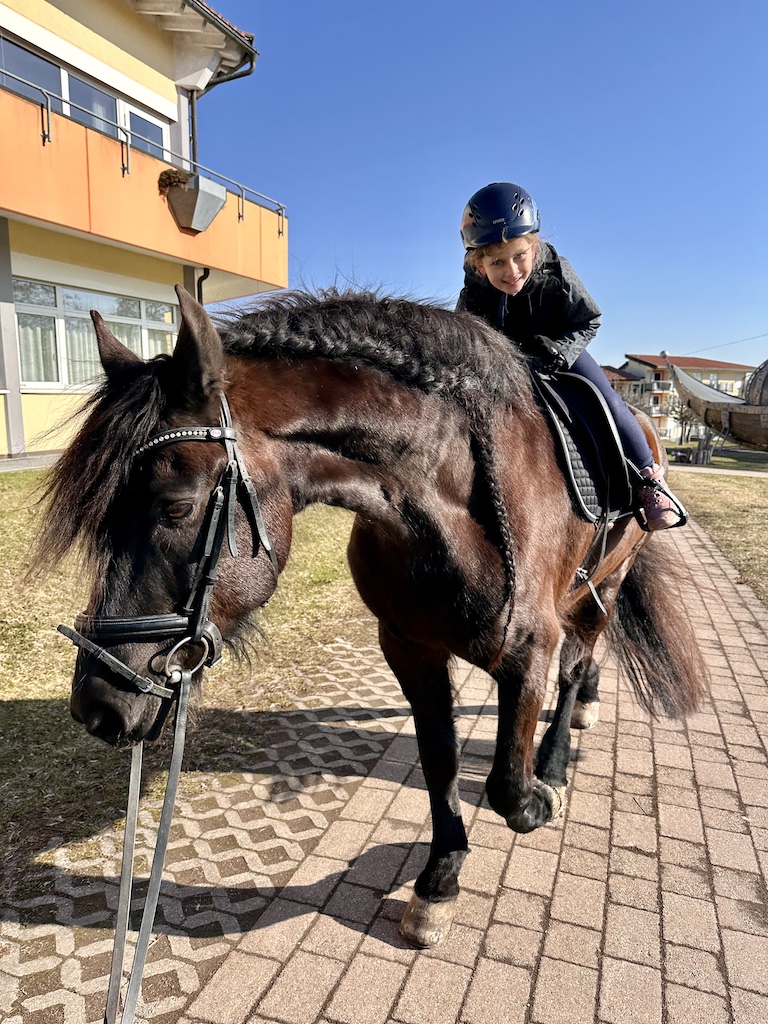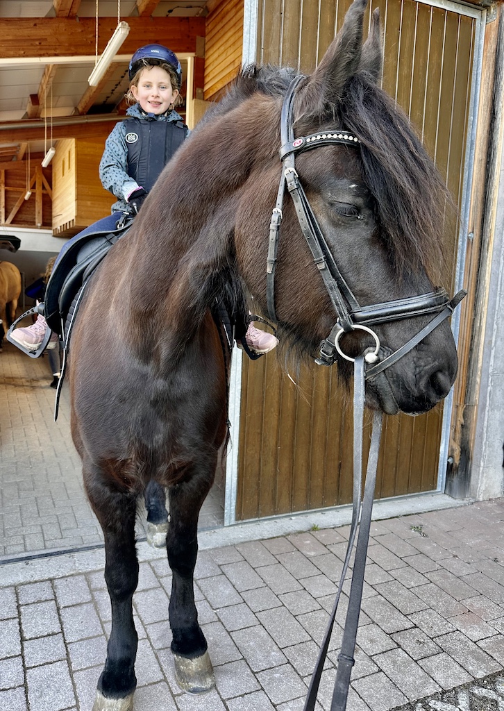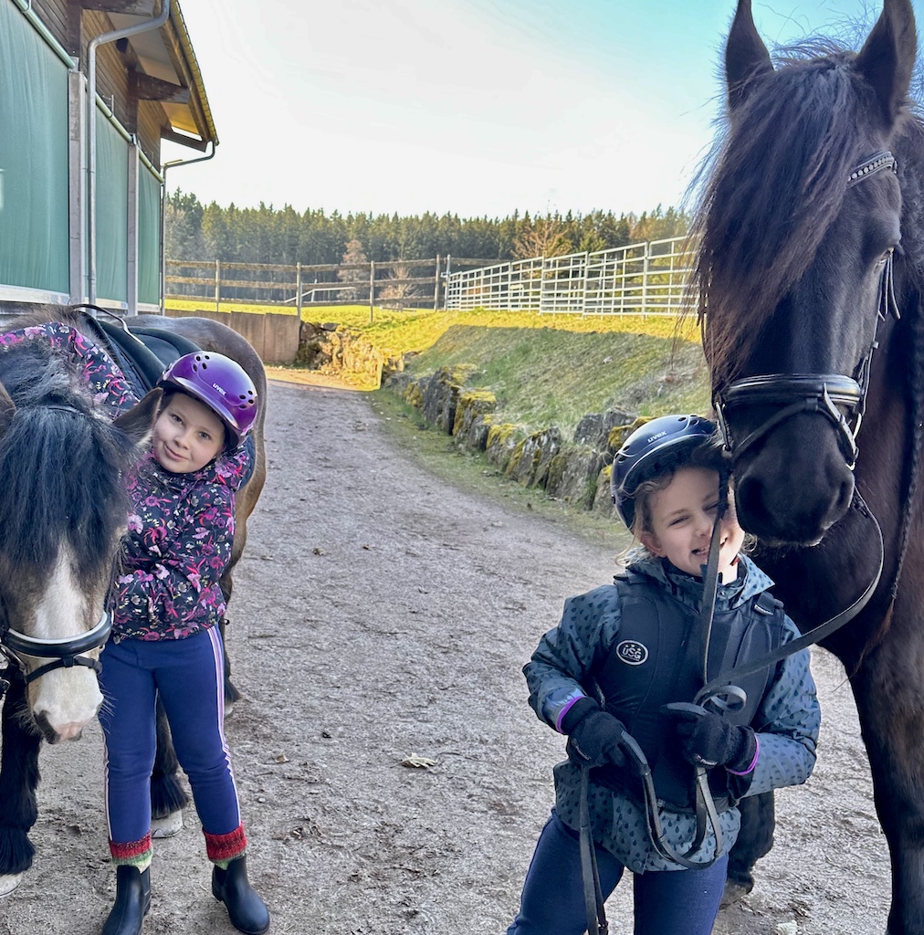Für die Beiden ging ein riesiger Wunsch in erfüllen, gemeinsam auszureiten. Cecile saß zum ersten Mal auf dem großen Leon und fühlte sich sofort sicher und geborgen. Leon ist nicht nur besonders schön anzusehen, er lieb Kinder über alles. Katharina bevorzugt unsere kleine und lustige Cookie. Cookie ist seit Herbst 2025 bei uns. Sie tritt fleißig in die Fußstapfen von Chek und ist trotz ihres jungen Alters bereits ein total zuverlässiger Ko-Therapeut ☺️👍🏼. Unser Trainerteam ist total happy mit unserer bunten Mischung an Pferden. Von groß bis klein, von ruhig bis aufgeweckt, ist alles dabei. Hierdurch finden wir immer ein passendes Therapiepferd für unsere REHA-Kids. Nun stand dem Ausritt nichts mehr im Wege und die Freude war Katharina und Cecile ins Gesicht geschrieben.