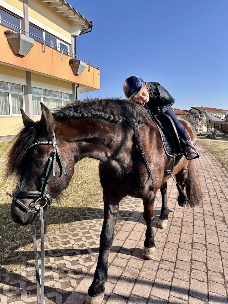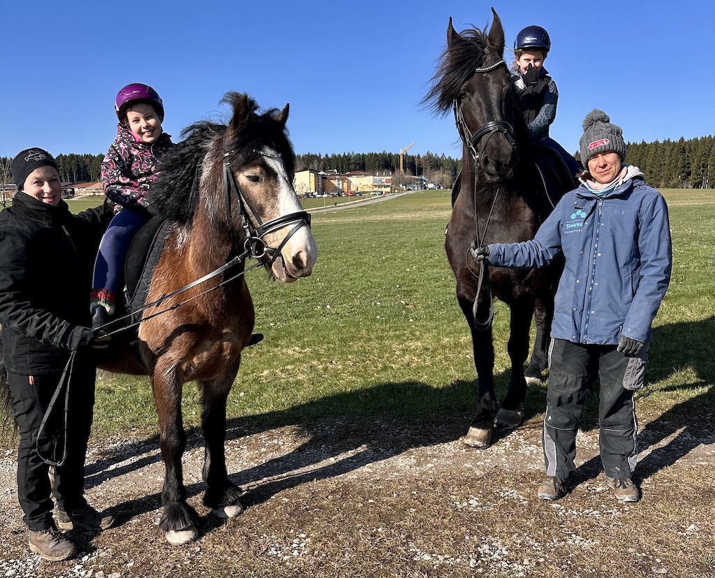 Die beiden REHA-Freundinnen Katharina und Cecile hatten zufälligerweise zeitgleich Hippo- bzw. heilpädagogische Reittherapie. Ein Vergnügen, denn beide sind Pferdenarren. Sie wünschten sich schon zu Beginn der REHA einen Pferdeausflug ins Gelände rund um Tannheim. Gestern war es dann soweit. Unsere Therapeutinnen Kristin und Miriam sowie Assistentin Barbara nahmen sich die Zeit und erlebten mit Katharina und Cecile einen wunderschönen Nachmittags-Ausflug zu Pferde. Vor der Freude stand zunächst die Arbeit, aber mit breitem Grinsen.