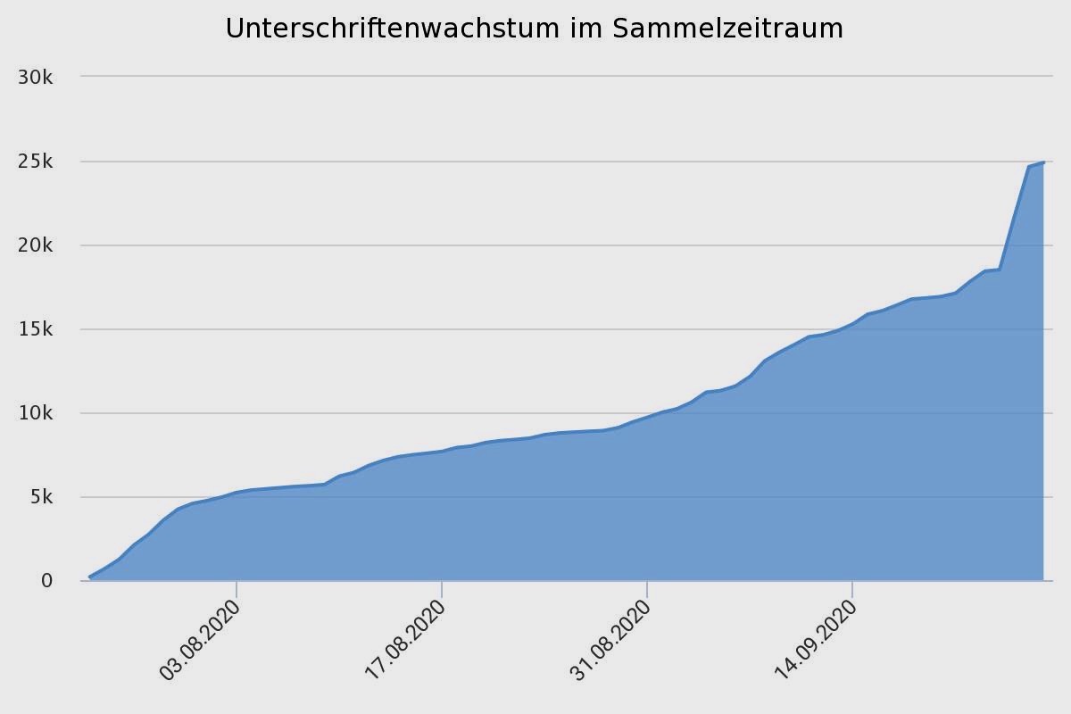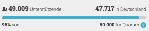 Die Verantwortlichen von openPetition haben aktuell beschlossen, unsere Petition um zwei Wochen zu verlängern. Sie fänden es sehr schaden, wenn wir das Quorum knapp verfehlt würden. Mit der Unterstützung der letzten Tage und Wochen sollte es gelingen, das Ziel 50.000 Unterschriften zu erreichen. Hier die motivierende Mitteilung von openPetition:
