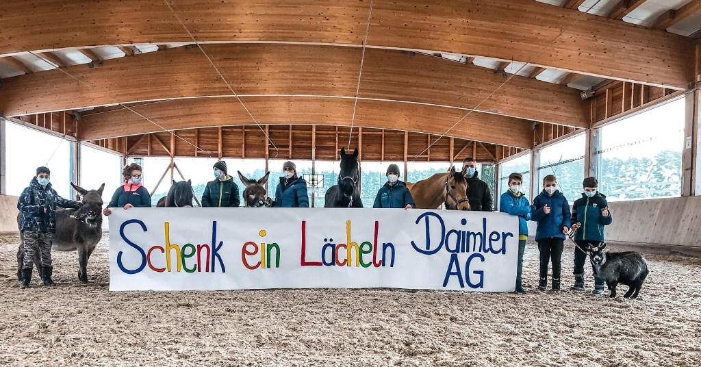 „Schenk ein Lächeln 2.0“ – unter diesem Motto startete das Mercedes-Benz Werk in Sindelfingen eine Weihnachts-Spendenaktion der Mitarbeiterinnen und Mitarbeiter. Von Anfang November bis Mitte Dezember 2020 konnten Mitarbeiterinnen und Mitarbeiter für acht verschiedene Projekte gemeinnütziger Organisationen online abstimmen. Die Nachsorgeklinik Tannheim hatte sich mit dem Wunsch auf ein Pony als Erweiterung für unsere Reittherapie vorgestellt.