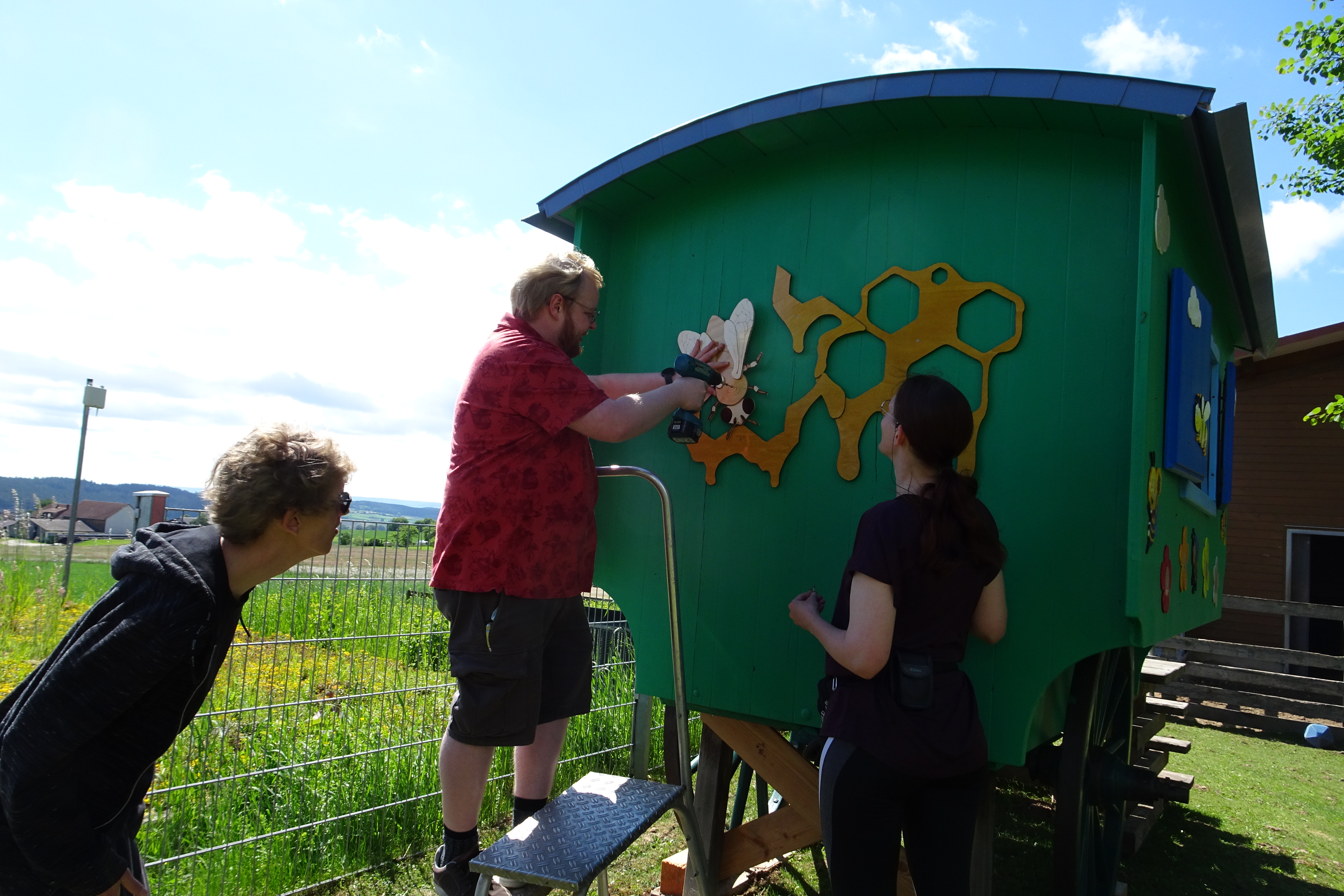 Familie Schmidtke besuchte uns im Mai zur REHA in Tannheim. Eine Ihrer gemeinsamen Aktivitäten fand in der Holzwerkstatt seinen Höhepunkt. Es entstand eine neues Bienenkunstwerk, das die Familie auch noch selbst am Schäferwagen montierte. Viele Stunden waren notwendig, dieses große und besonders schöne Kunstwerk zu fertigen. Wir sind begeistert und werden uns gerne an diese außergewöhnliche Künstlerfamilie erinnern.