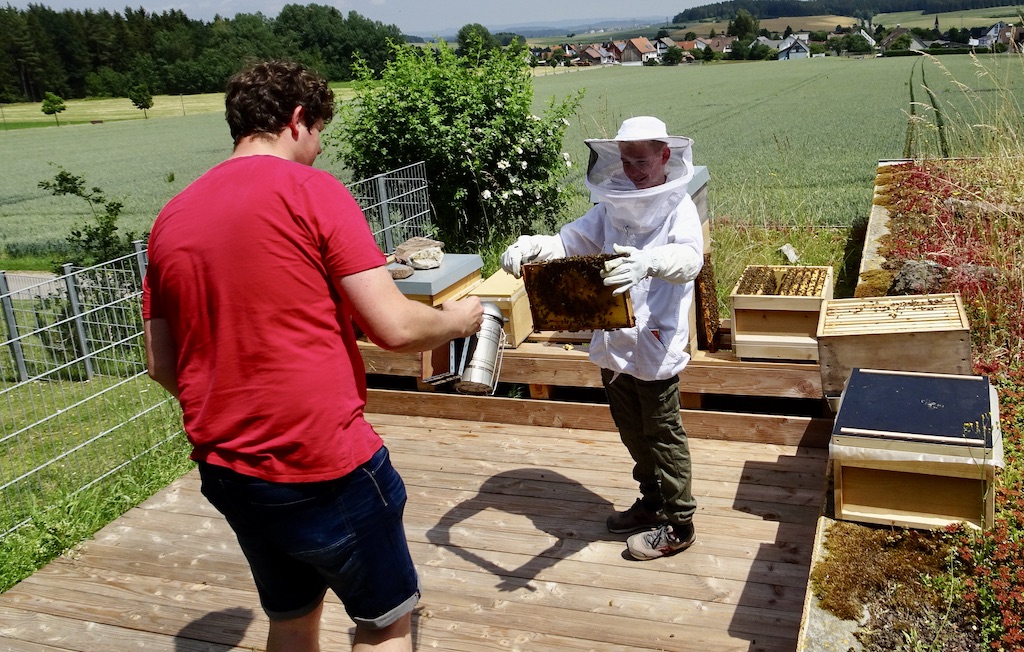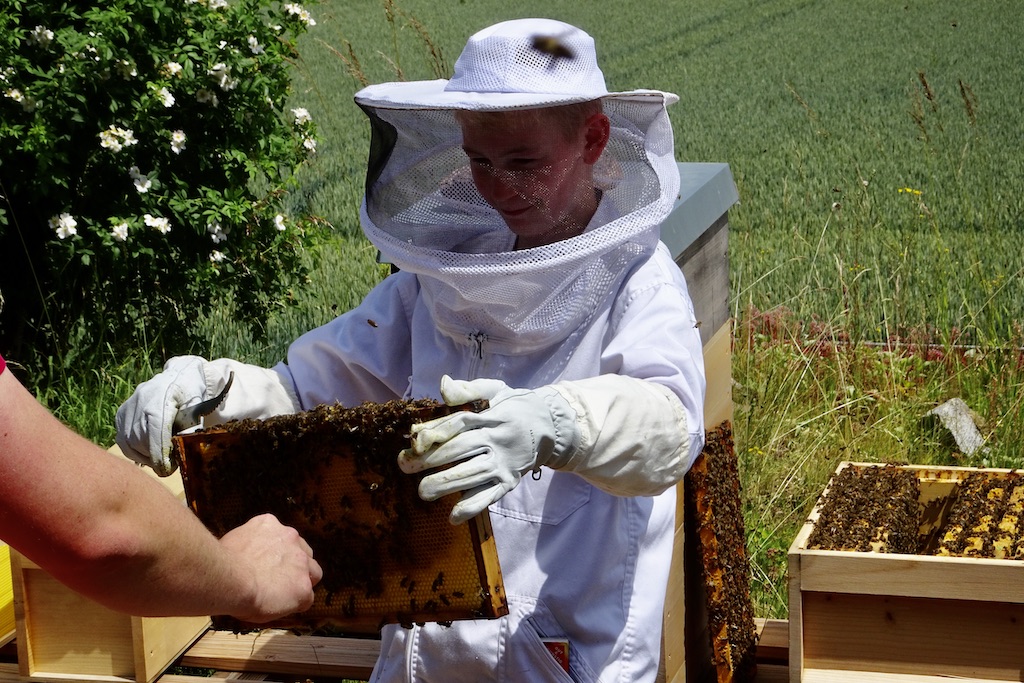 Daher ist alle 7 Tage zu kontrollieren, ob das Bienenvolk sich unkontrolliert teilen will oder gezielt von Max geteilt werden muss. Keine einfache Aufgabe, aber wer Honig ernten will, muss ihn sich hart erarbeiten. Wir sind schon sehr gespannt auf die ersten Honigernte. 14 Kilo unbehandelten Honig gibt es bereits, und bis Juli wird noch etwas mehr hinzu kommen. Danach Honig schleudern, in Gläser abfüllen und verschenken. Wir freuen uns darauf.