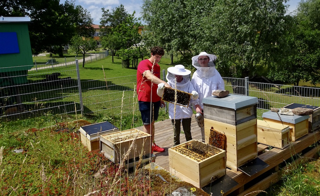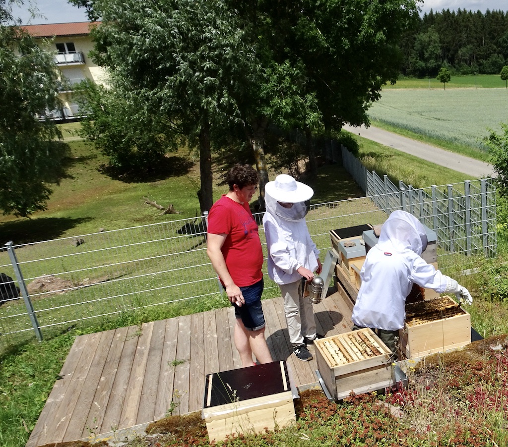 Unser Erzieher und Hobbyimker Max bringt nicht nur Ordnung in die Schlupflochgruppe (Kindergruppe der Klinik), sondern hat auch unsere fleißigen „Bienenvölker“ fest im Griff. Das ist auch notwendig, um ein unkontrolliertes Schwärmen unserer beiden Bienenvölker zu verhindert. Durch das Schwärmen (teilen eines Bienenvolkes) verliert man nicht nur Bienen, sondern der neue Schwarm nimmt immer einen Teil der Honigvorräte mit.