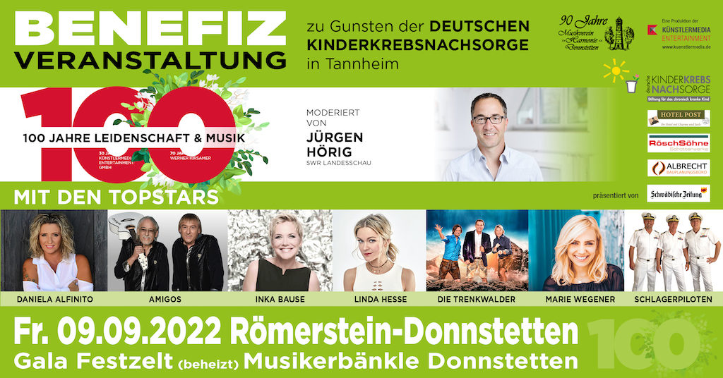 Auf die Benefiz-Veranstaltung in Römerstein-Donnstetten am 9.9.22 zu Gunsten der Nachsorgeklinik Tannheim weisen wir sehr gerne hin. Der Vorverkauf ist gestartet und benötigt noch Unterstützung. Unterstützen Sie die Nachsorgeklinik in Tannheim und machen Sie sich eine musikalische Freude. Unser Vorstand im Förderverein Jürgen Hörig moderiert diesen besonderen Schlager-Abend.