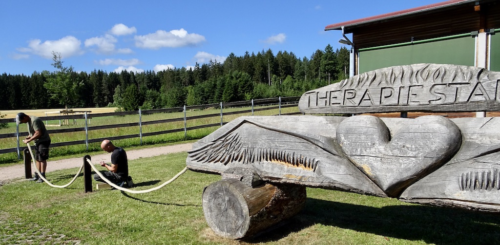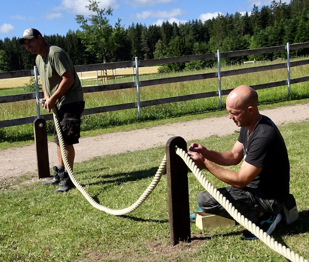 Wie gut, dass wir immer wieder Väter von Patientenkindern ermuntern können, uns bei der Arbeit zu helfen. So auch in der Juli-REHA. Unser Wunsch war, das übrig gebliebene Schiffstau von der Bienenwiese als Parkplatz-Abgrenzung anzubringen. Somit ist die angrenzende Wiese geschützt. Gesagt, getan. Herzlichsten Dank an die Herren Lüttich und Ocker für Ihre Hilfe. Und Spaß hat es offensichtlich auch noch gemacht.