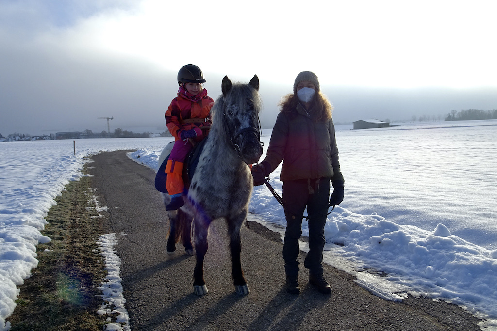 …muss in Tannheim früh aus den Federn sein. Die Sonne kämpft sich um diese Zeit noch durch den Frühnebel, inzwischen machen sich Reiterin und Pony fertig zum Ausritt.
