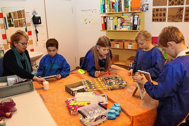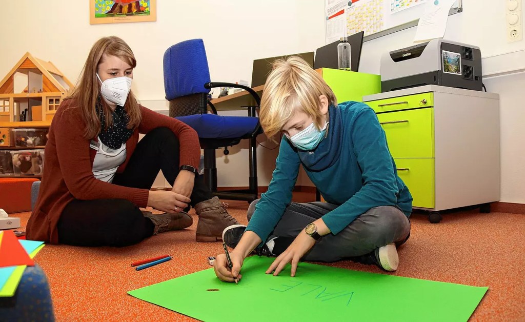 Nadine Straub, Heilpädagogin in der Nachsorgeklinik Tannheim, (von links) beobachtet, wie Finn ein Plakat in Erinnerung an seinen verstorbenen Bruder zeichnet. | Bild: Cornelia Putschbach