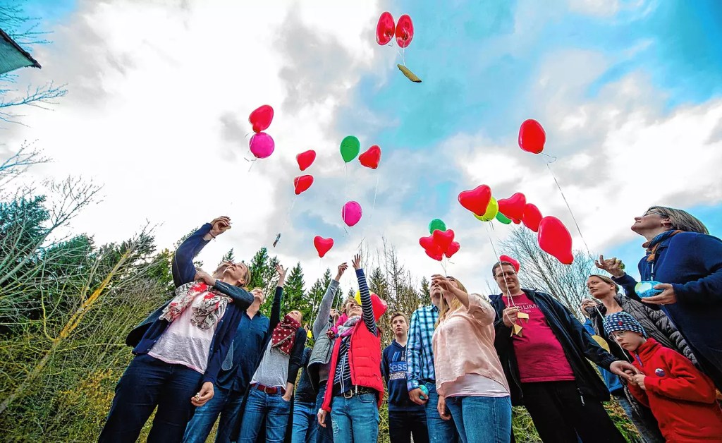 Beim gemeinsamen Abschluss einer Reha für verwaiste Familien der Nachsorgeklinik Tannheim lassen Eltern für ihre verstorbenen Kinder Luftballons in Herzform zum Himmel steigen. | Bild: Wilfried Dold