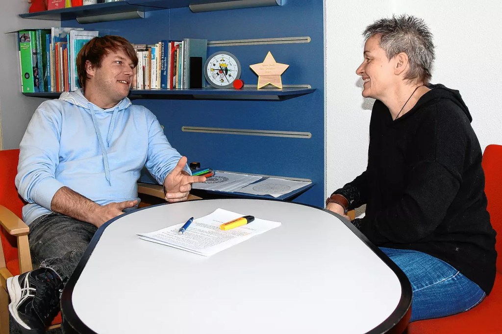 Die beiden Mitarbeiter des psychologischen Dienst der Nachsorgeklinik Tannheim, Bennet Klein und Eva Herget-Berthomé unterhalten sich über die Reha für verwaiste Familien. | Bild: Cornelia Putschbach